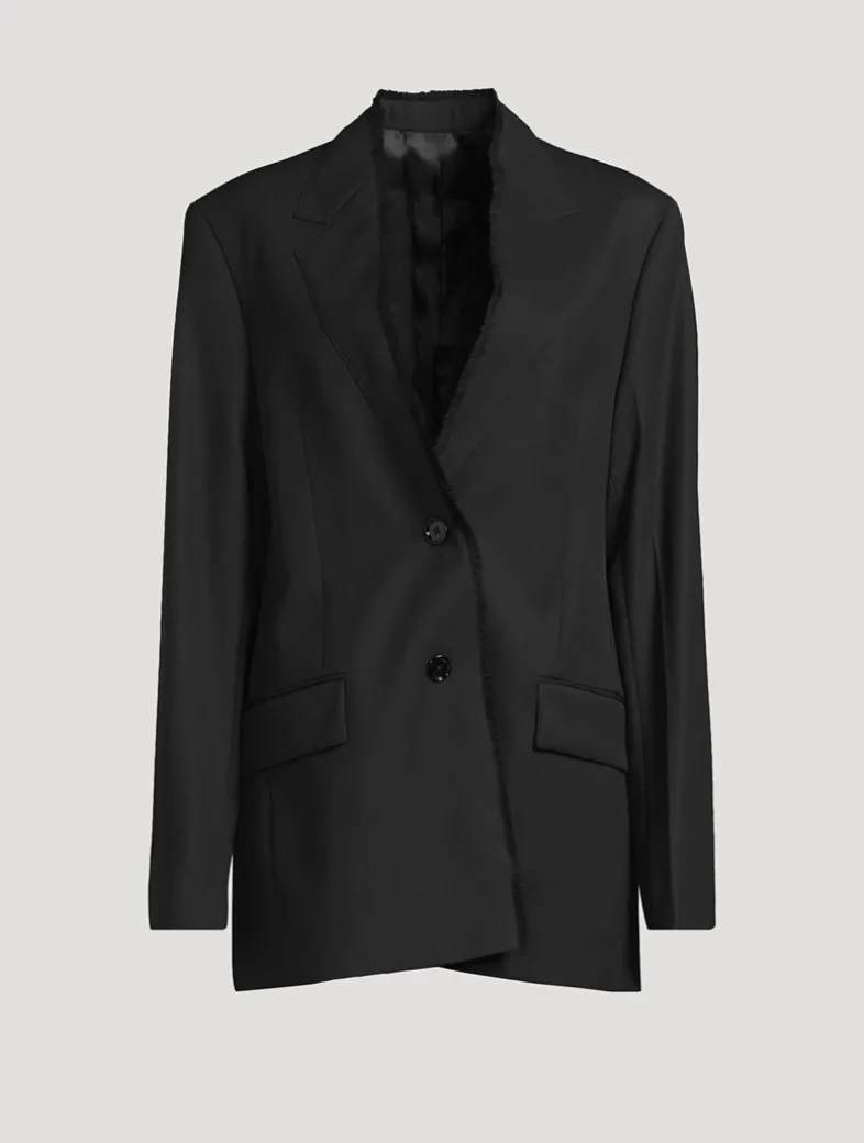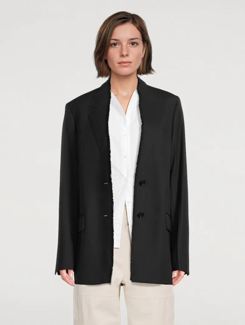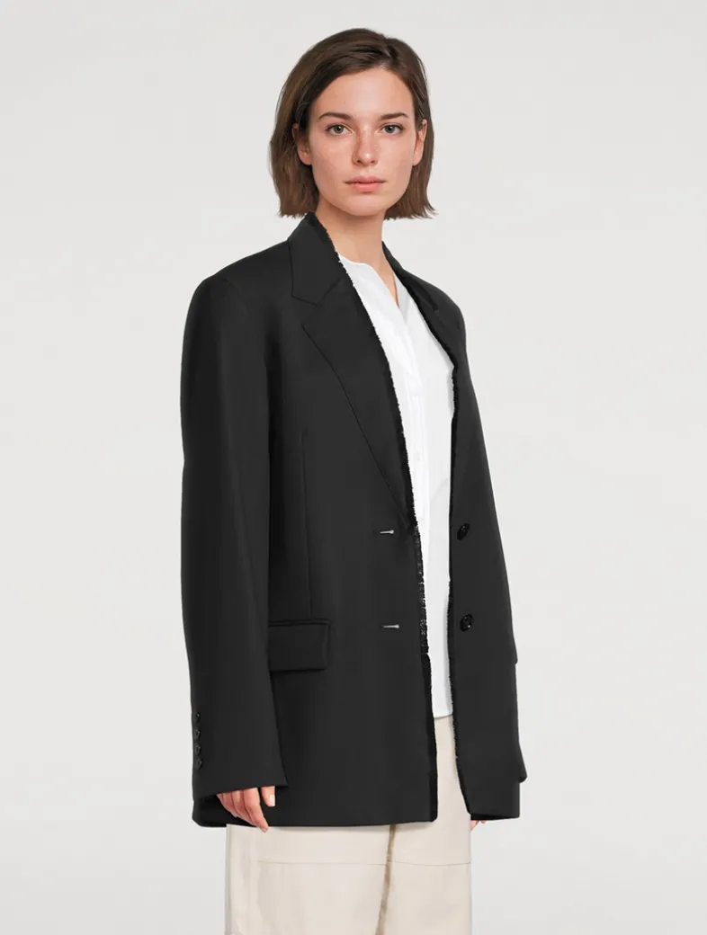 A statement runway piece, this TOTEME suit jacket is a reflection of the collection’s penchant for meticulous tailoring. Made from structured wool twill, it has a sharp, oversized silhouette with lapels that are sewn into the body and frayed for a raw, artisanal finish.