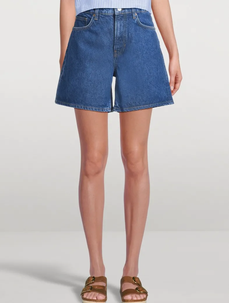 These cotton-blend jean shorts are cut to a mid-rise, relaxed-leg silhouette with a longer length and clean hem.