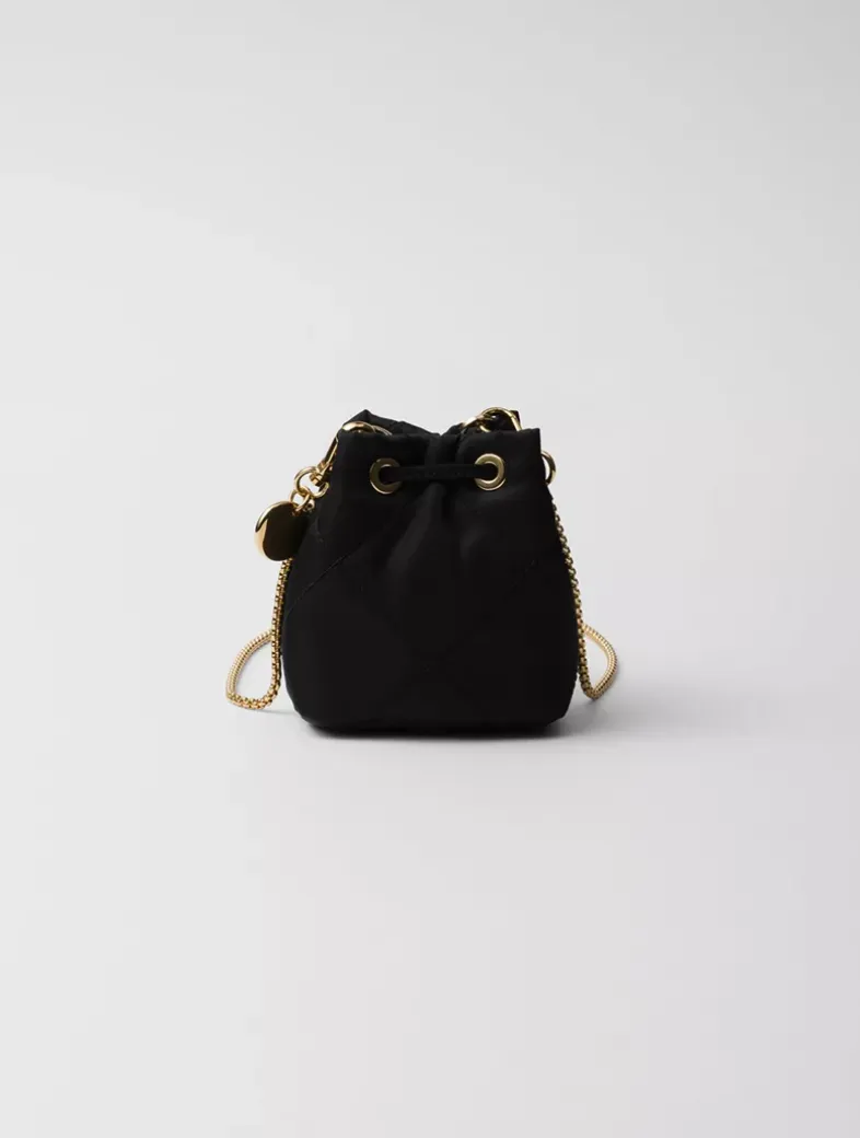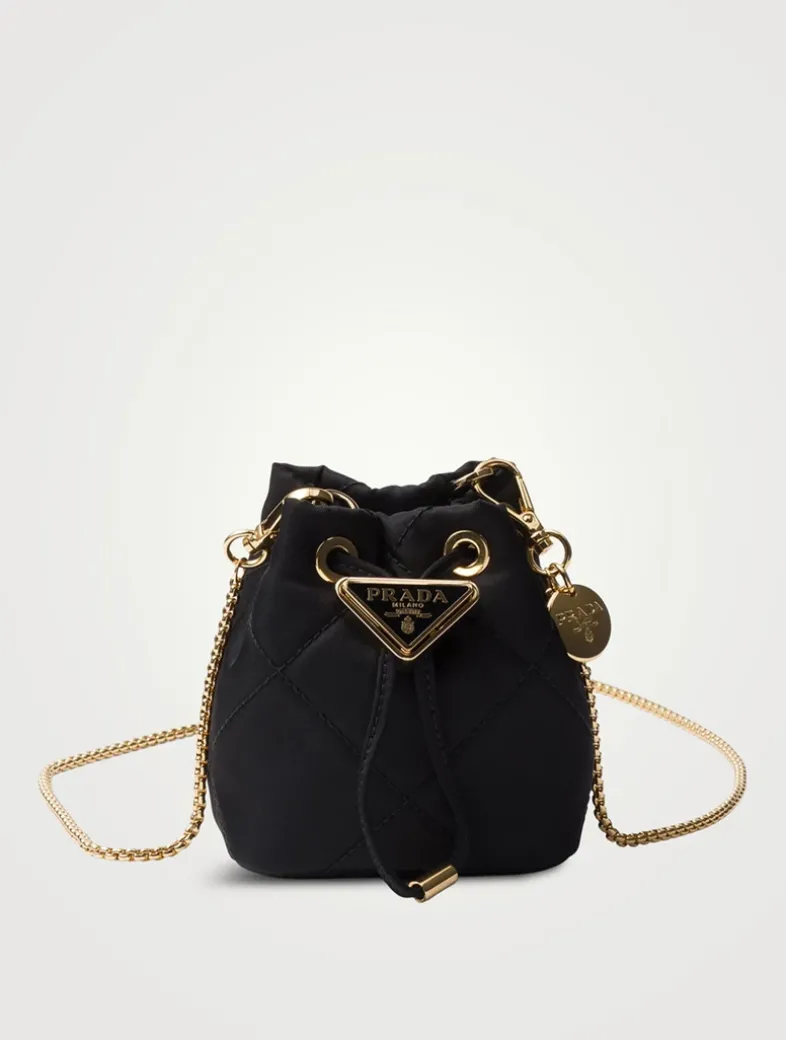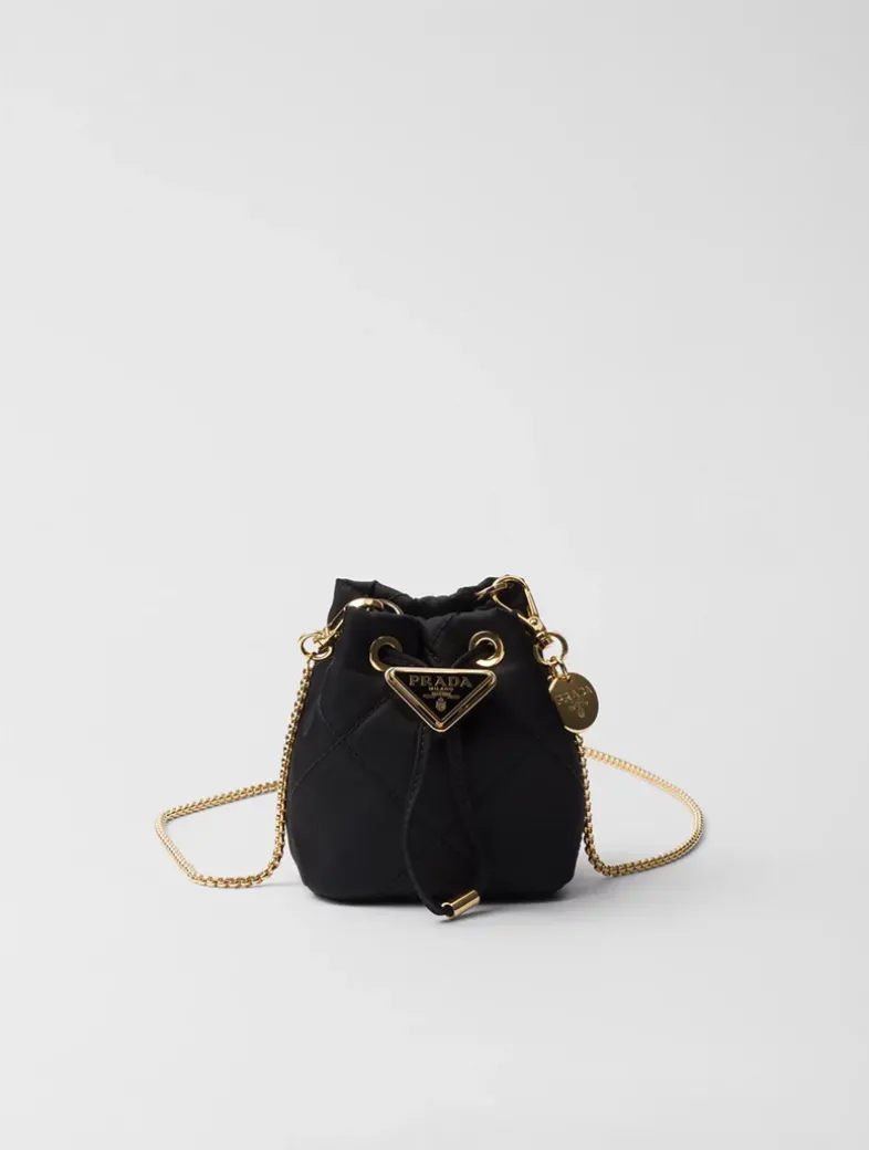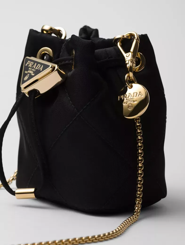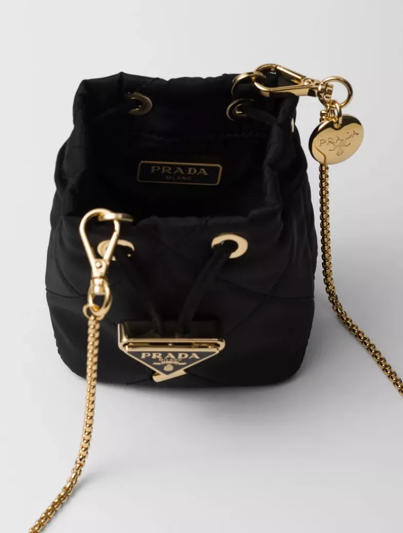 With stitching Drawstring closure Enameled metal triangle logo on closure Removable chain shoulder strap Re-Nylon lining