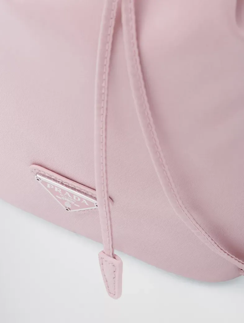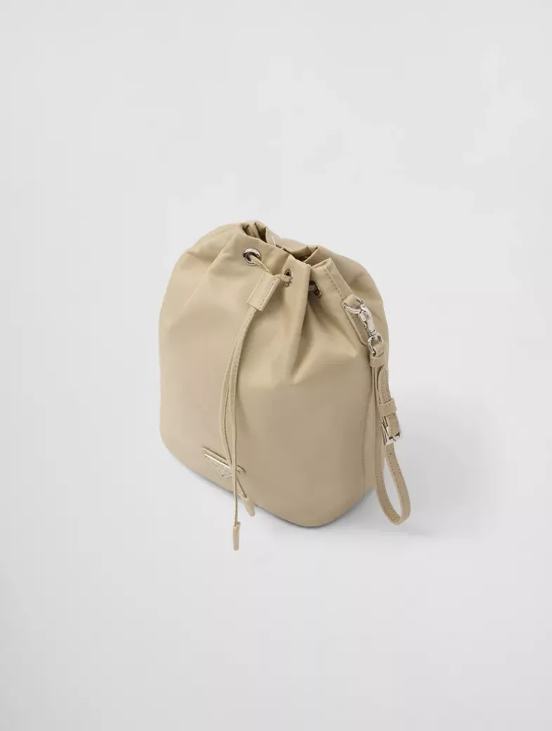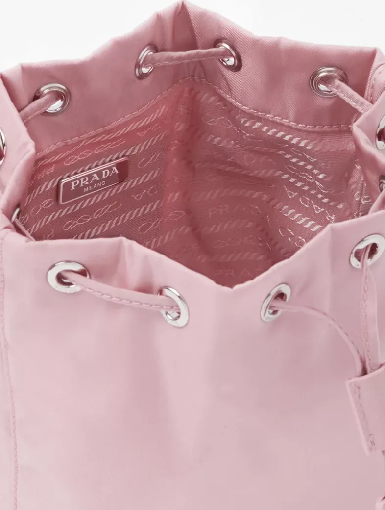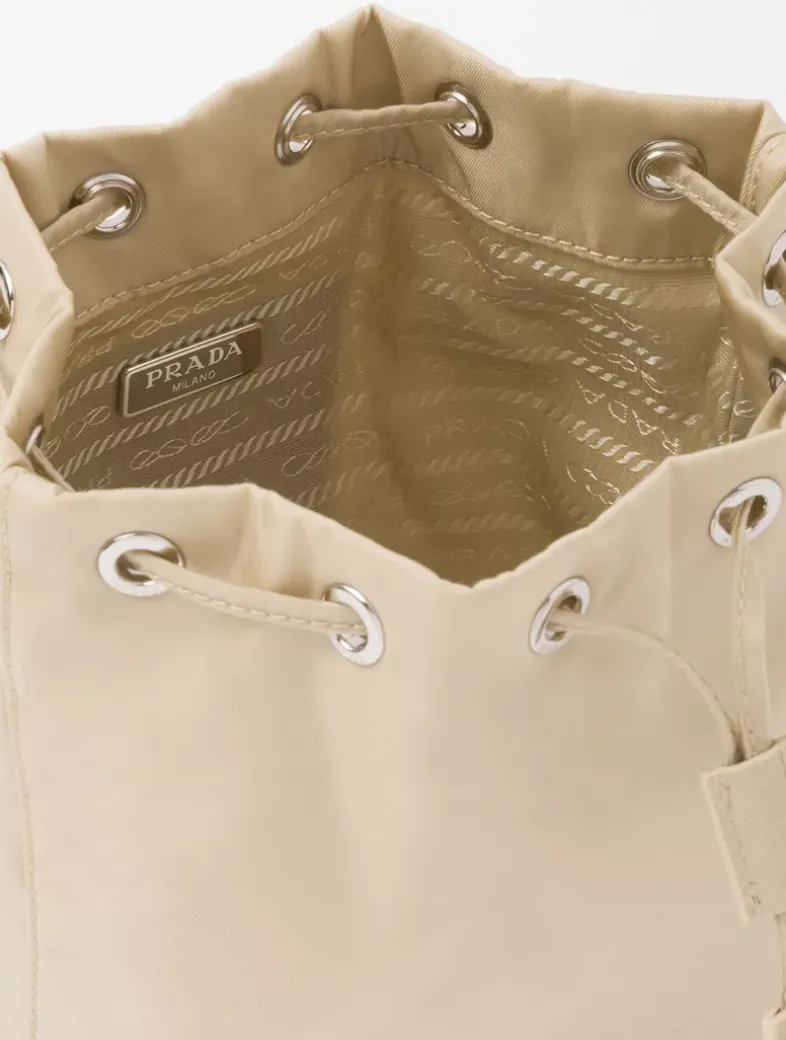 Drawstring closure Enameled metal triangle logo Detachable leather handle Re-Nylon lining