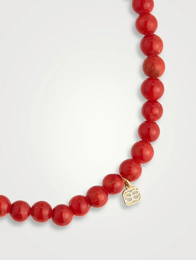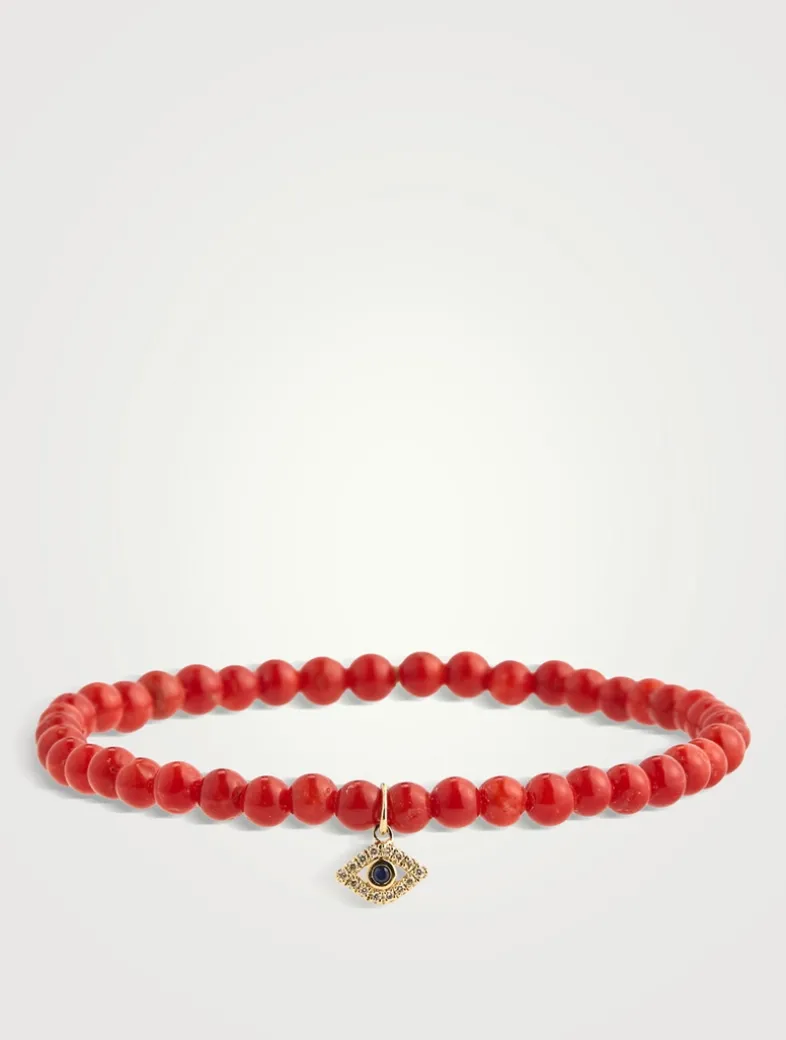 Strung with red coral smooth round beads, this slip-on bracelet features a tiny bezel evil eye charm with brilliant diamonds. All Sydney Evan beaded bracelets are strung on a stretch cord along with a 14k gold SE logo charm.