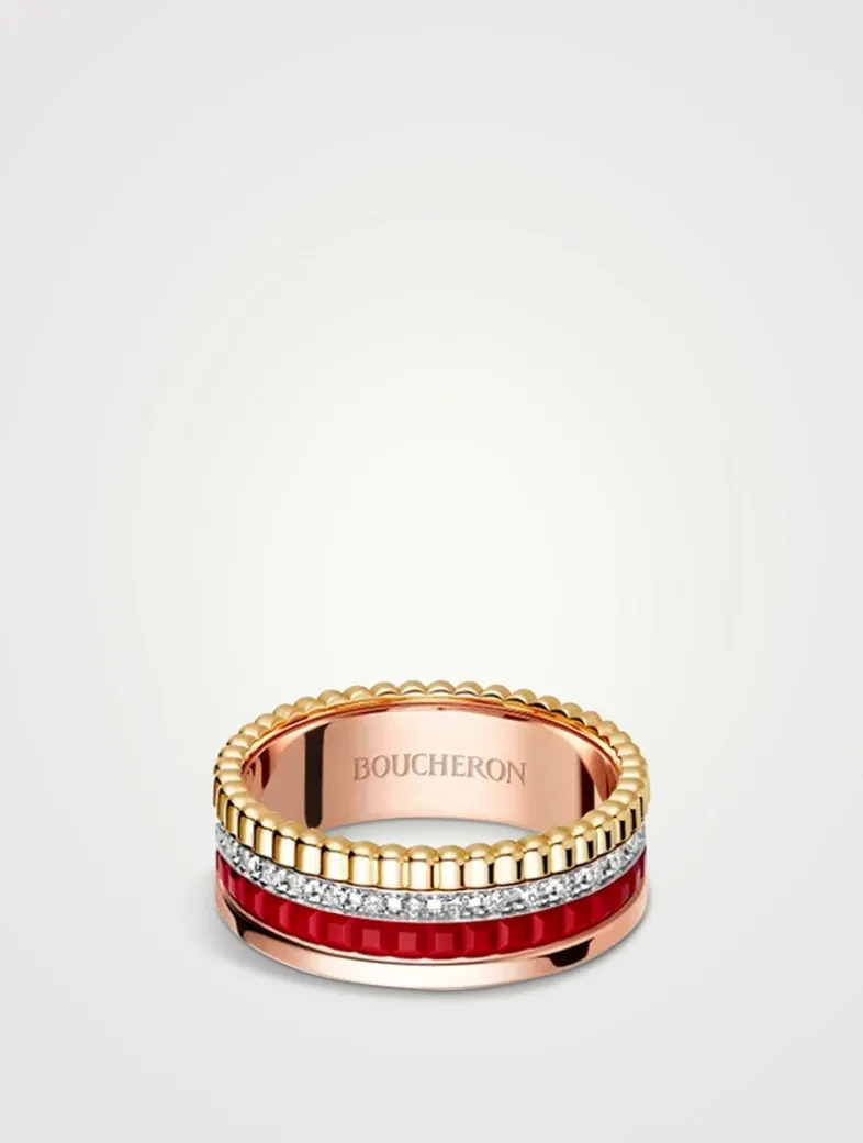 Quatre, a Boucheron icon, takes on bold red in this small ring, blending matte Hyceram, a line of brilliant diamonds, and the rich tones of three golds for a striking, modern statement.