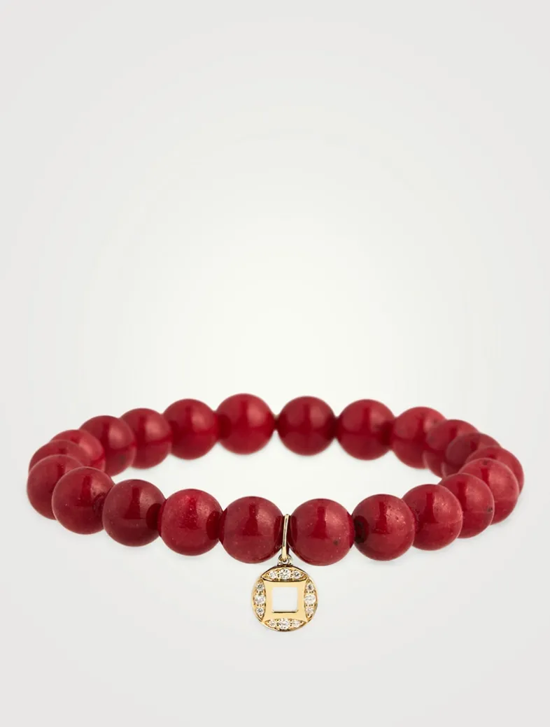 Made from smooth red jade beads, this slip-on bracelet is detailed with a 14k gold and pavé diamond lucky coin charm. All Sydney Evan beaded bracelets are strung on a stretch cord along with our 14k gold SE logo charm.