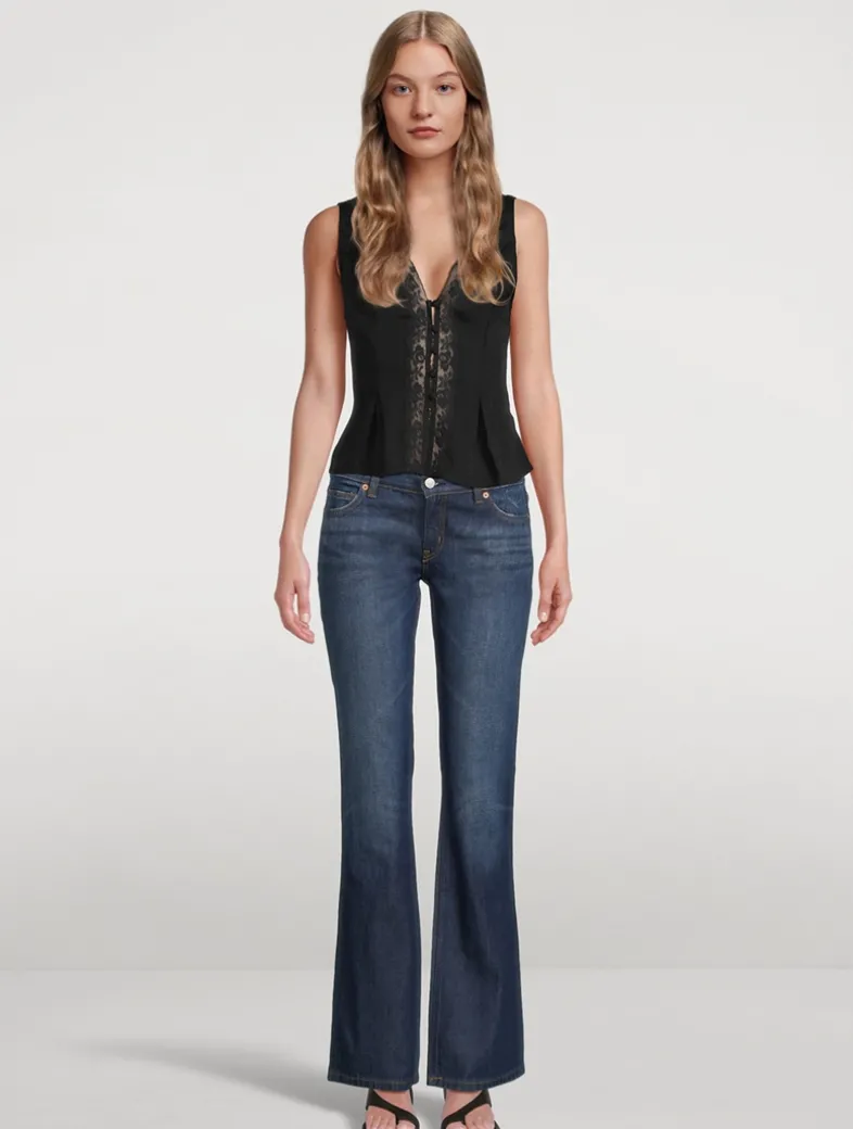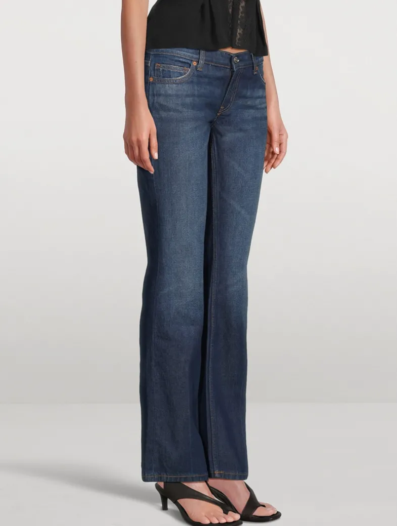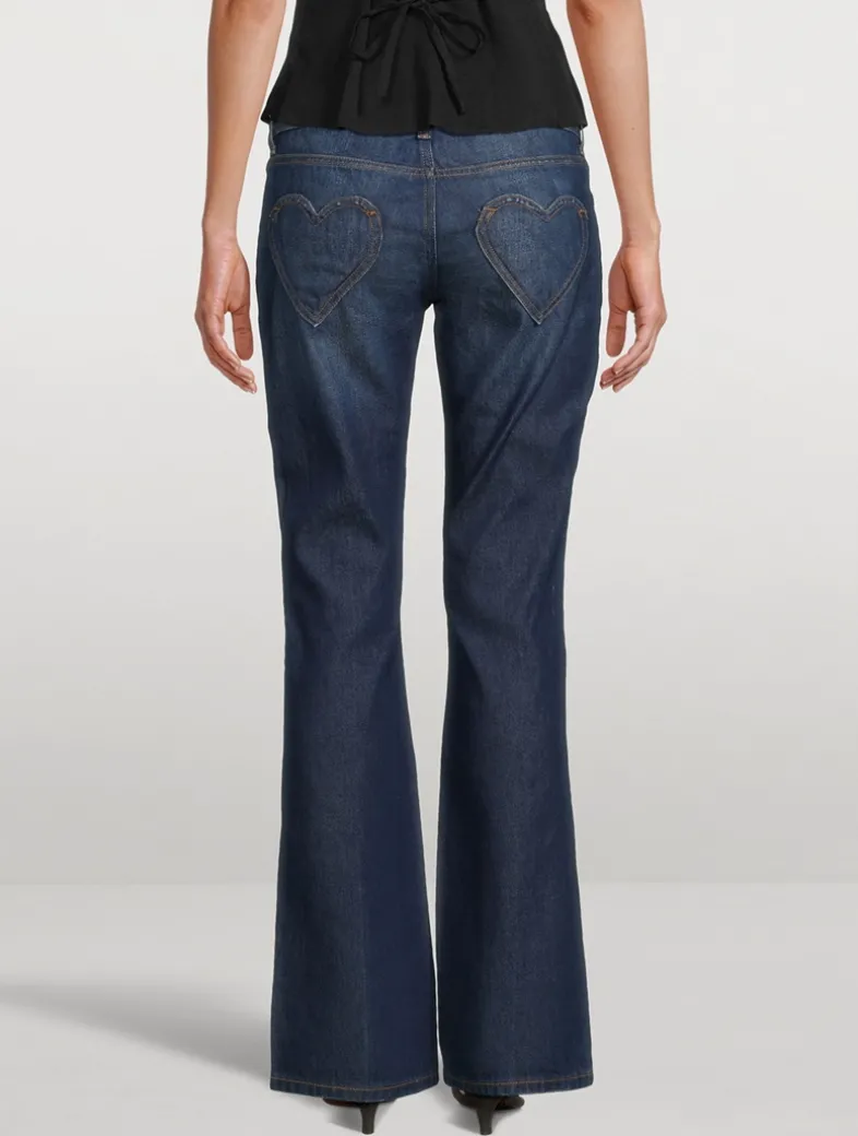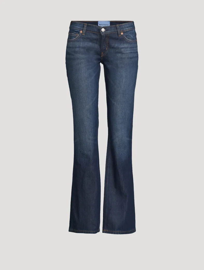Devon Lee Carlson designed this collection for Reformation. Inspired by her personal style, each piece is made with sustainable materials. Adorned with heart-shaped patch pockets at the rear, these low-rise jeans are cut to a slim, bootleg fit. Certified to the Organic Content Standard Blended (OCS Blended) with >50% organic content.