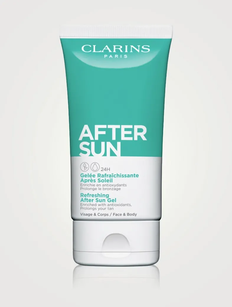 The ultimate in targeted post-sun skincare. With 40 years of suncare expertise, now Clarins Research goes further in skin protection with a proprietary after sun formula that preserves your skin’s youth and beauty with unrivaled results. Clarins’ ultra-sensorial, tan-enhancing face and body gel is infused with moisture-packed plant extracts—including Aloe Vera and Watermelon—that hydrate skin for 24 hours! Sunflower extract helps minimizes the feeling of sunburn and helps soothe. Safflower extract promotes an intense, long-lasting, glowing tan that resists peeling and flaking. Free radical-fighting Mimosa Tenuiflora leaves skin soft, smooth and incredibly comfortable—perfectly prepped for another day in the sun. The aromatic scent—a tropical woody floral with a sparkling hint of citrus—is sure to brighten your day.