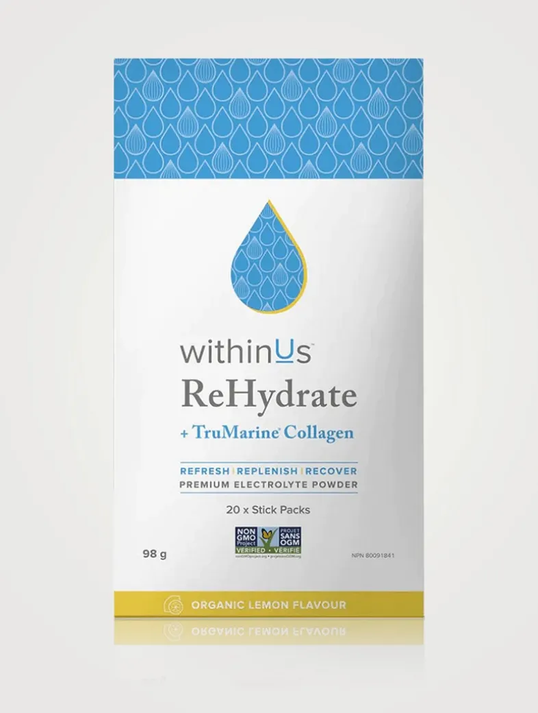 withinUs ReHydrate + TruMarine® Collagen is an electrolyte blend formulated with premium ingredients. This refreshing, thirst-quenching blend is packed with essential electrolytes for optimized hydration and TruMarine® Collagen to accelerate post-workout recovery and aid lean muscle gain.