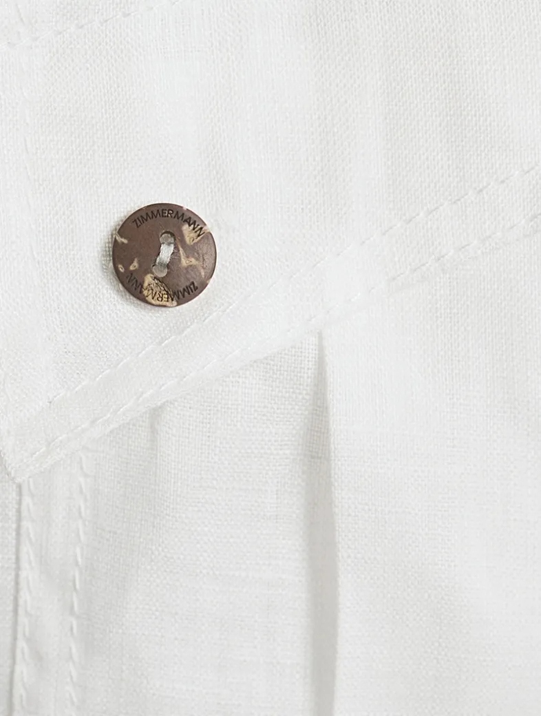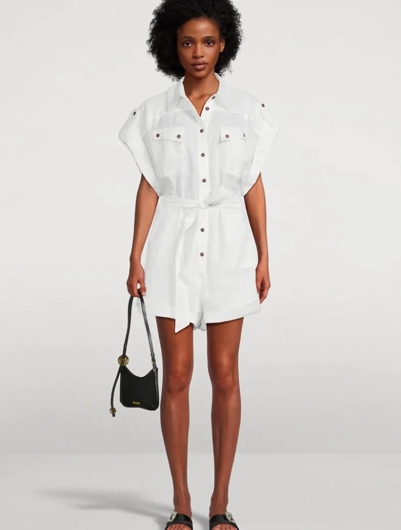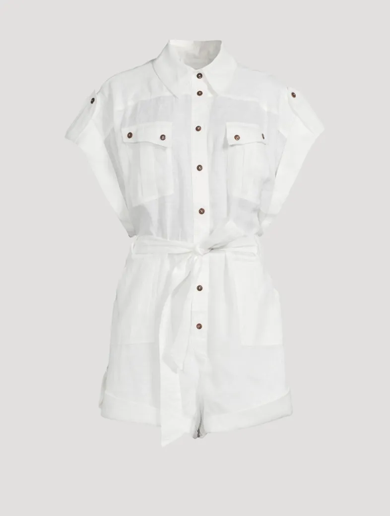 Crafted from lightweight linen, this cap-sleeve jumpsuit has a light-as-air feel. It has a matching fabric belt that knots at the waist. Utility patch pockets at the chest and epaulets complete the look.
