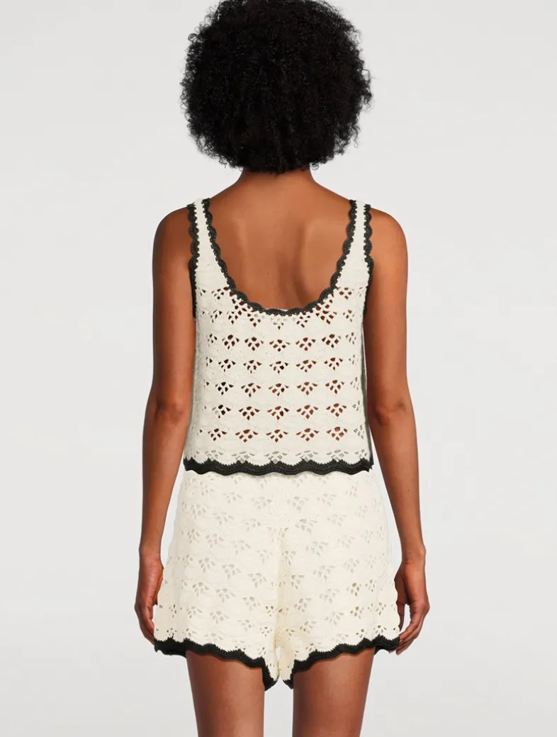 A knit tank featuring contrasting scalloped edging and an open-weave crochet pattern. It is cut to a cropped length with a deep scoop neckline and fixed shoulder straps.