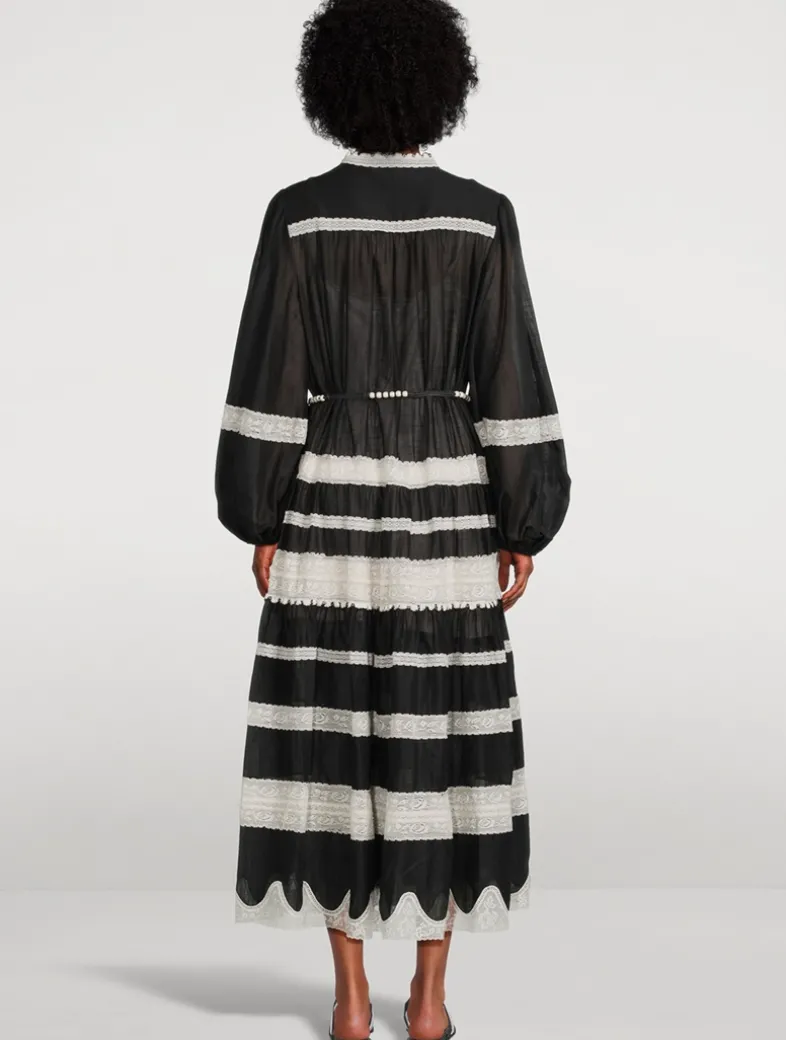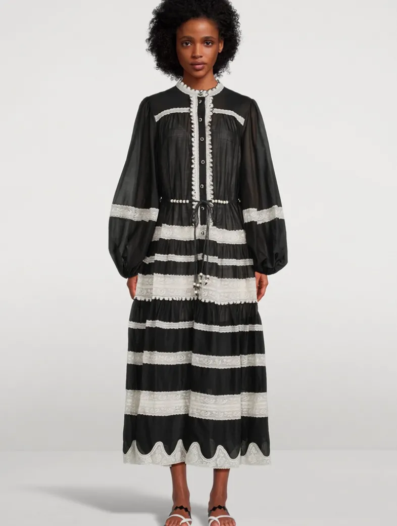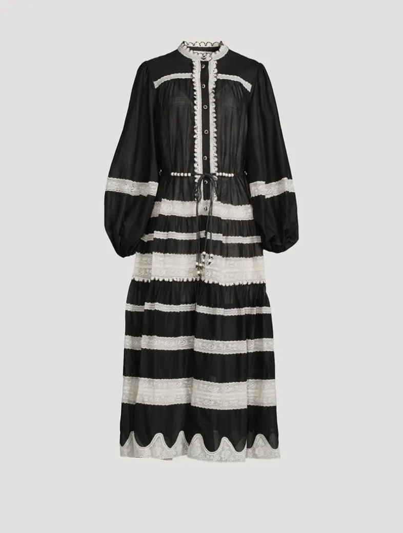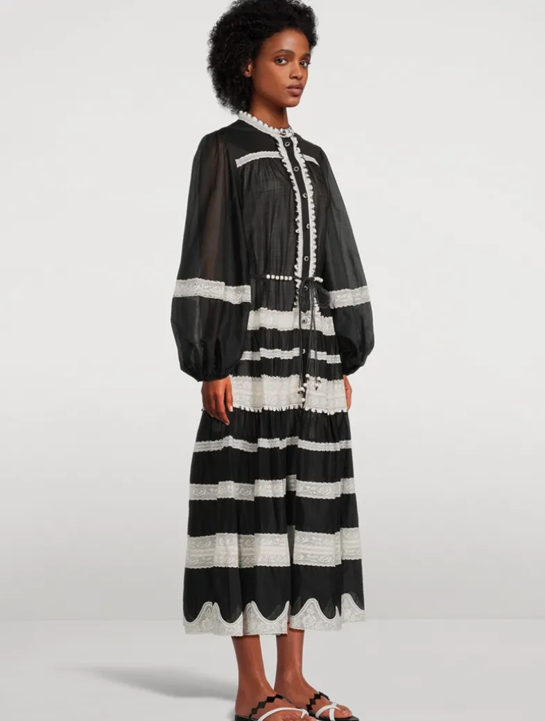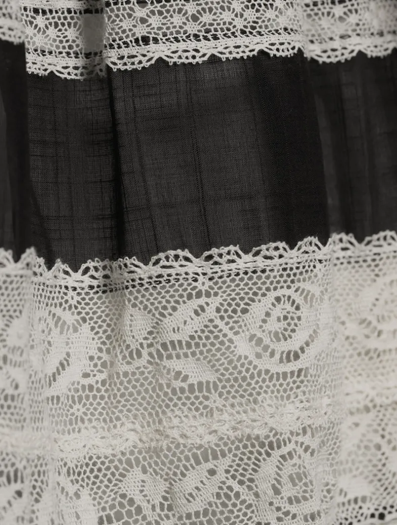 This cotton dress is spliced with contrasting crochet trims. It features a stand collar, billowing sleeves with elasticated cuffs, and buttons down the centre front. It is cinched with a removable wood beaded tie belt and comes with a separate slip.