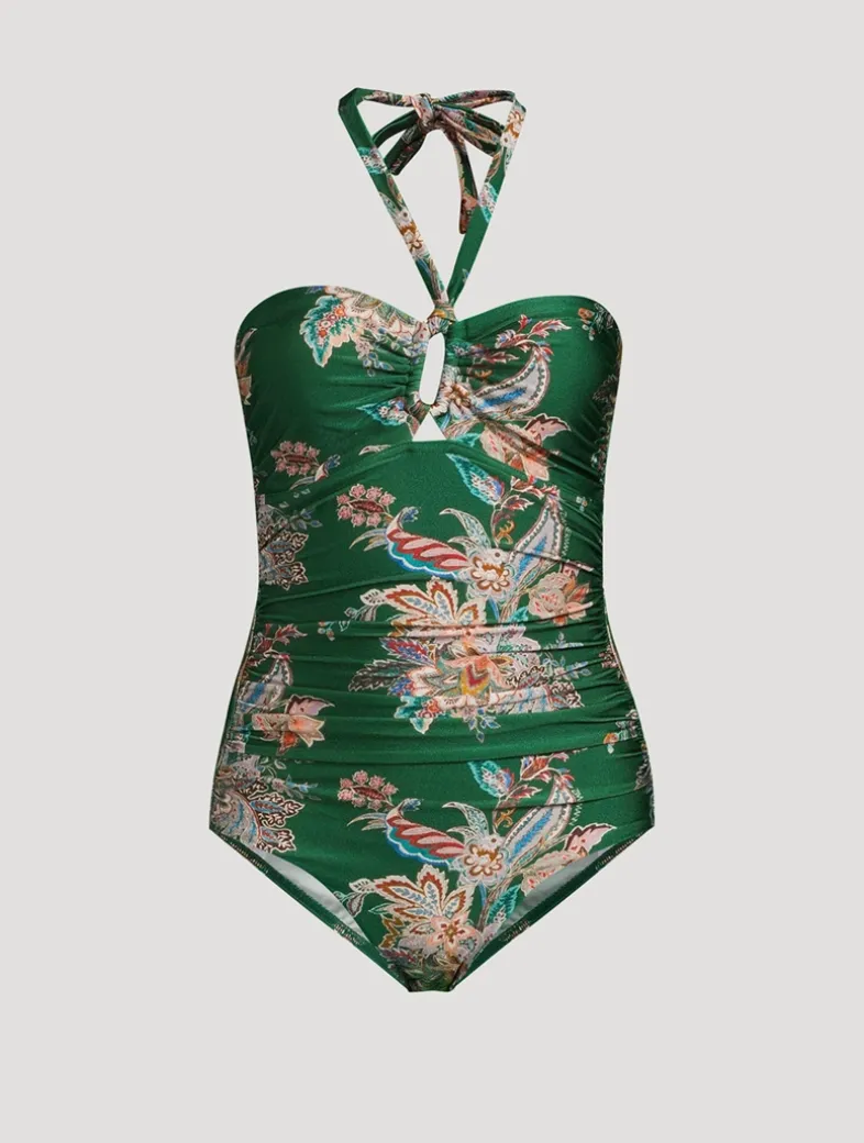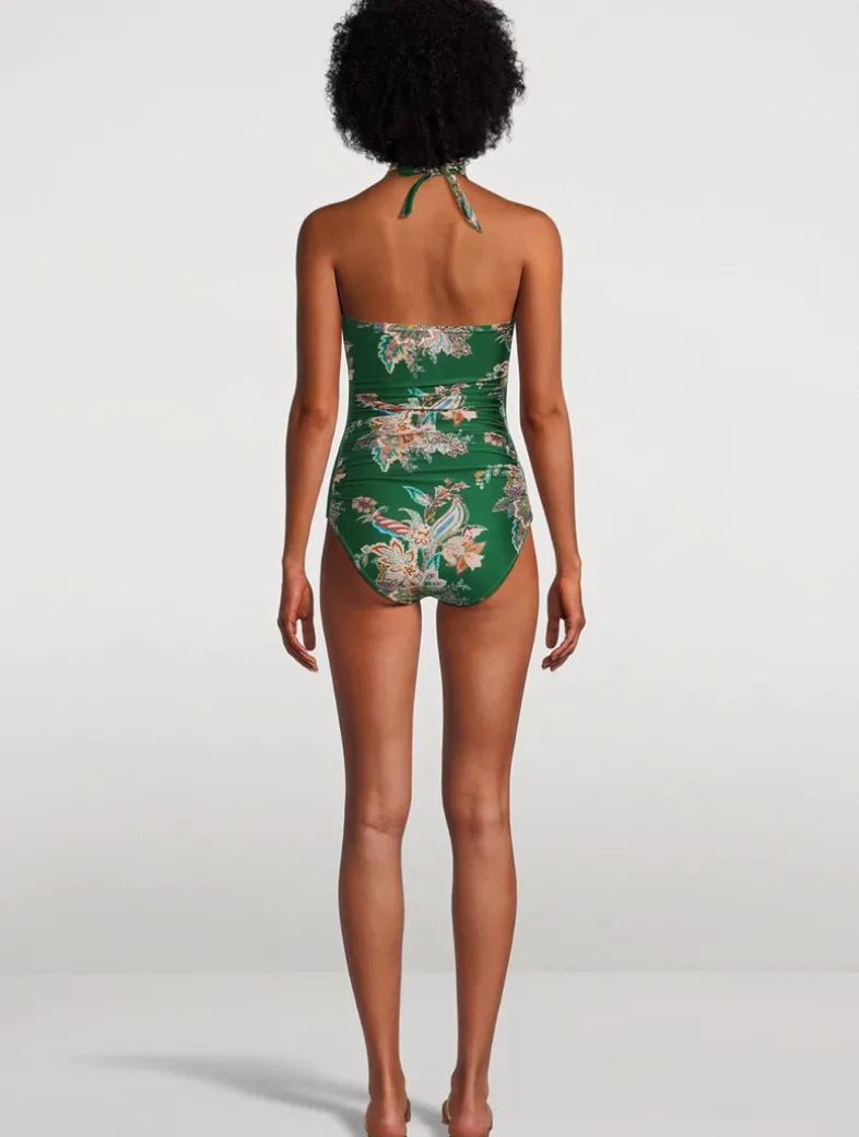 This swimsuit features a halter neckline with a wide link detail at the centre bust. Featuring ruching throughout the body, it has a full coverage bottom, removable straps and cups, and gripper elastic and boning for hold and bust support.