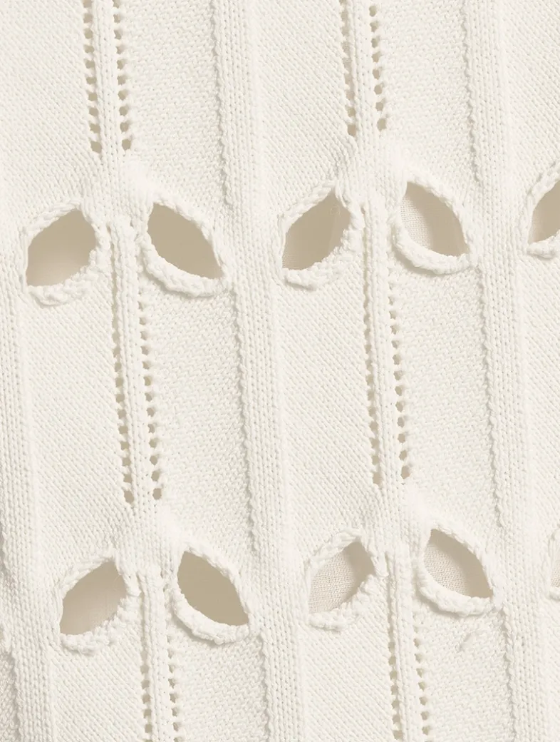 Knit shorts featuring a mid-rise elastic waist with an adjustable drawstring. They are embellished with pointelle details and scalloped edges at the cuffs.