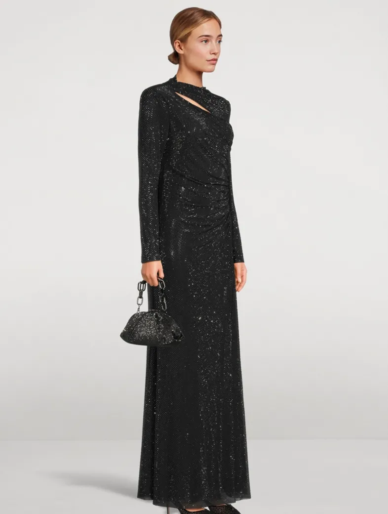Crafted from rhinestone-studded mesh, this floor-sweeping dress pairs its striking, high-shine feel with a sleek silhouette and an edgy cut-out to match. Finished with a mesh lining, removable shoulder pads, and a zip closure at the back.