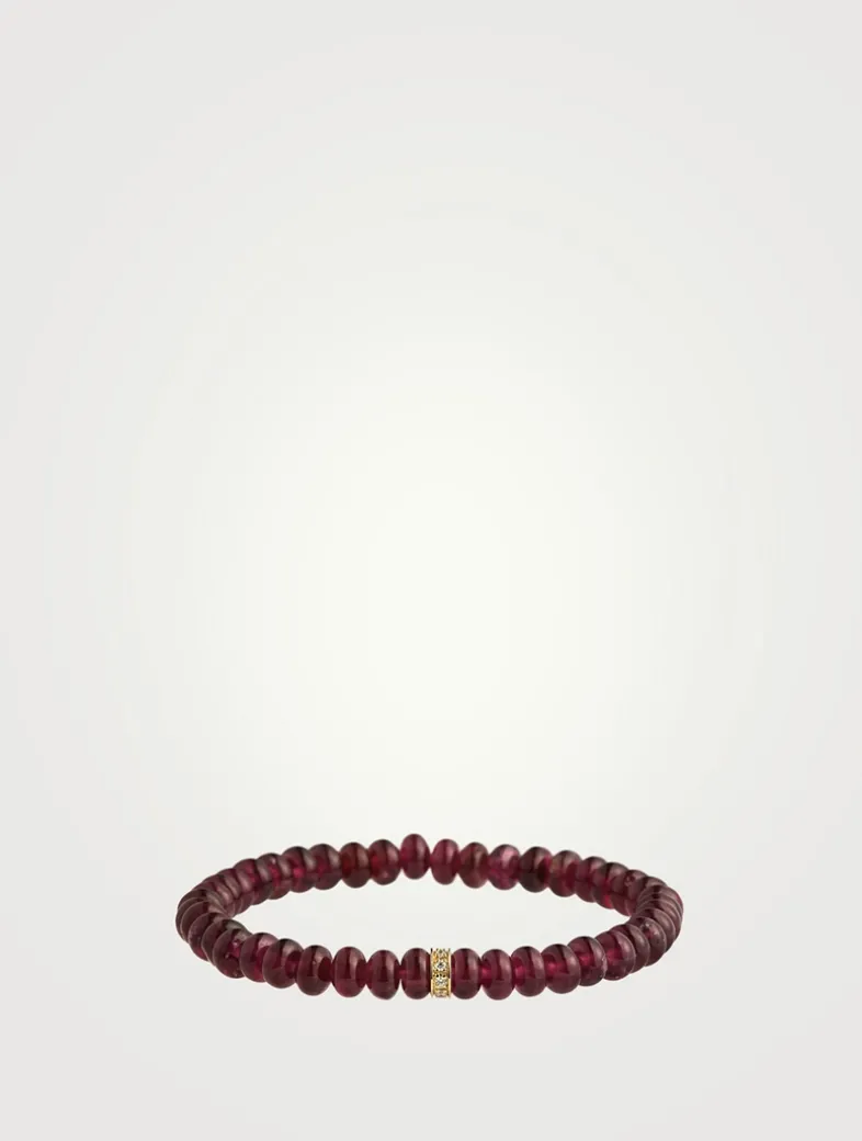 Strung with rhodolite beads, this slip-on bracelet features a sparkling diamond rondelle. All Sydney Evan beaded bracelets are strung on a stretch cord along with a 14k gold SE logo charm.