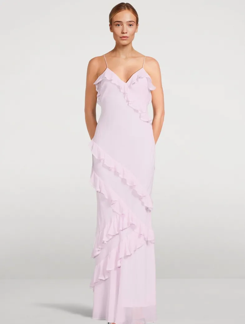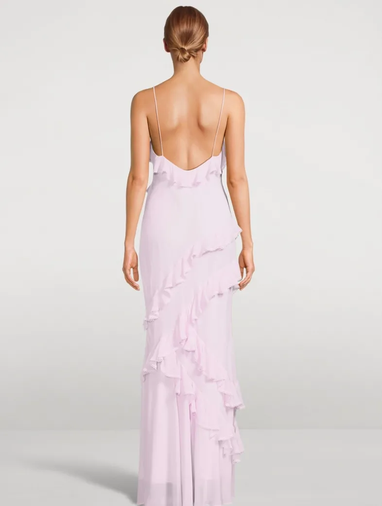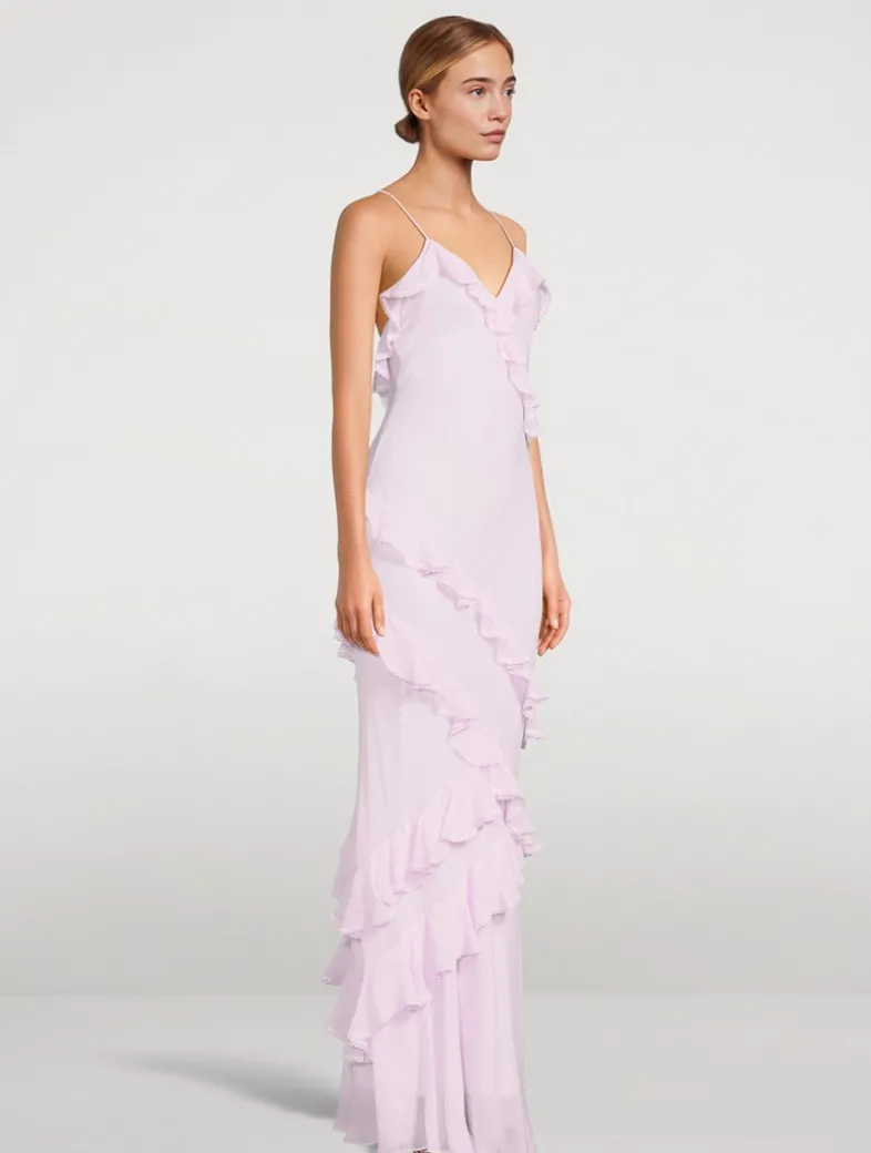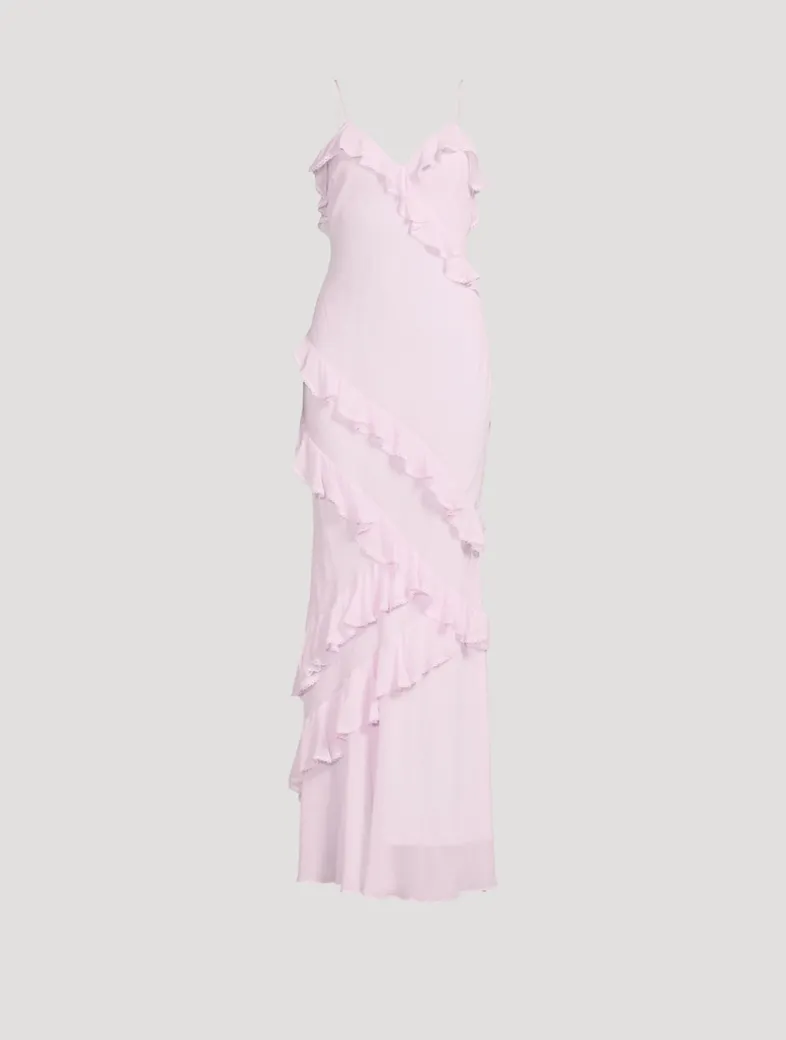 The Rialto Dress stuns with overlapping, asymmetrical ruffles at the neckline that continue to descend through the entire skirt. Slightly fitted, this dress features a sexy silhouette framed by slim straps.