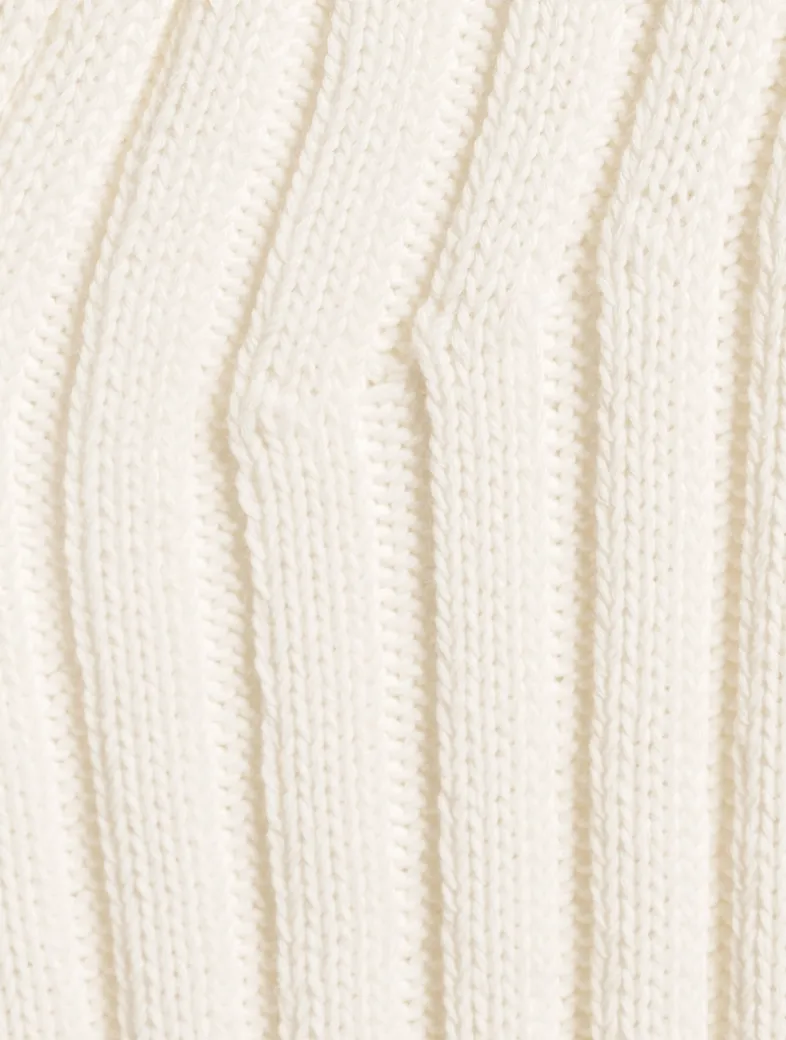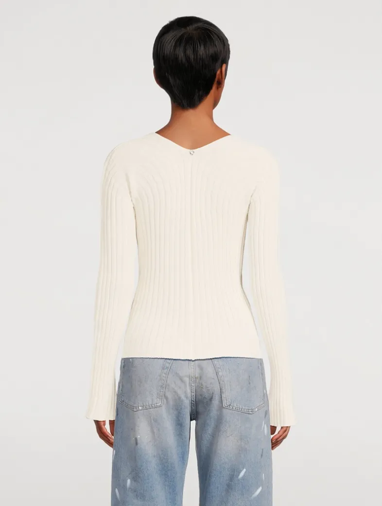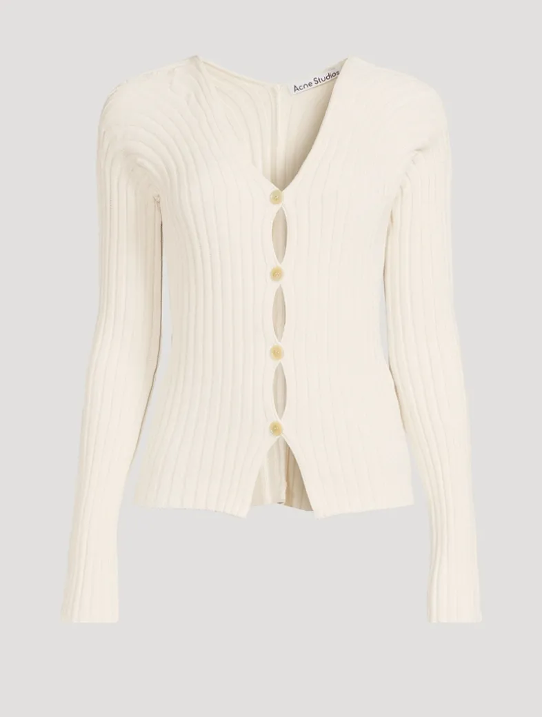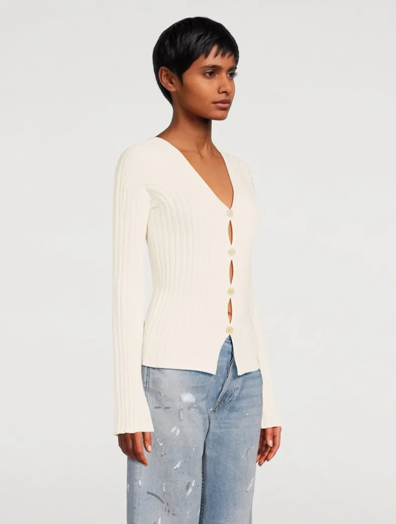 Knit from cotton yarns, this long-sleeve sweater has a ribbed texture and a V-neckline. It has a buttoned closure that pulls slightly to reveal a hint of skin.