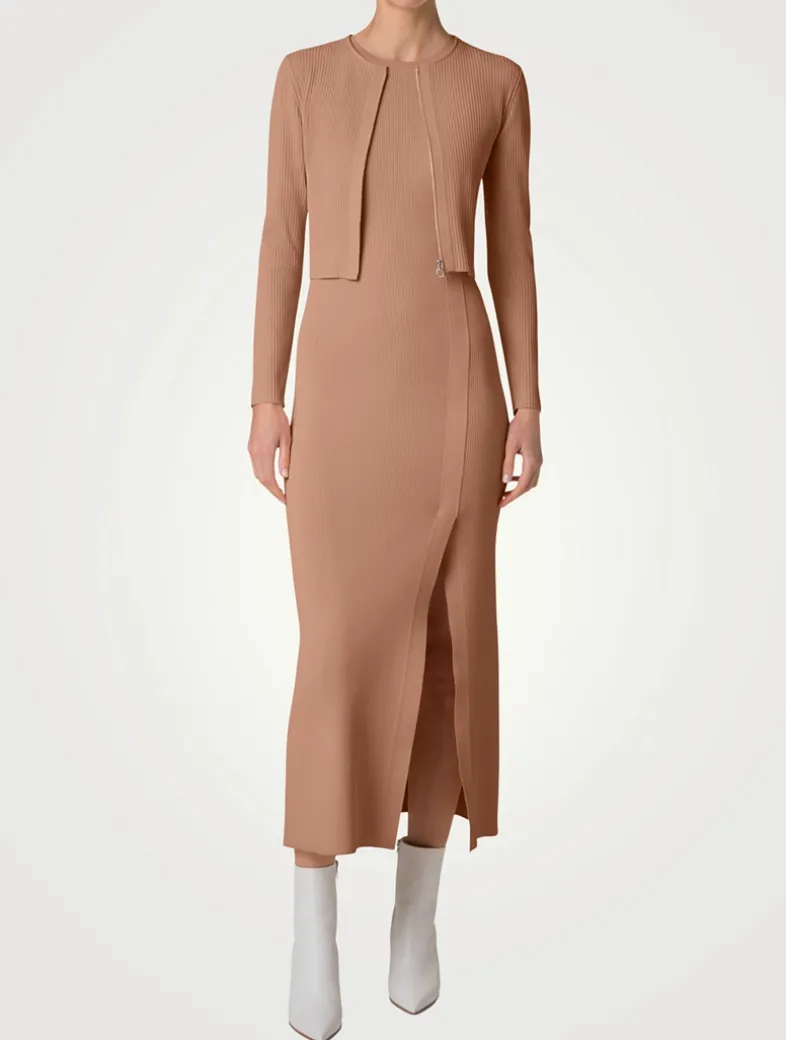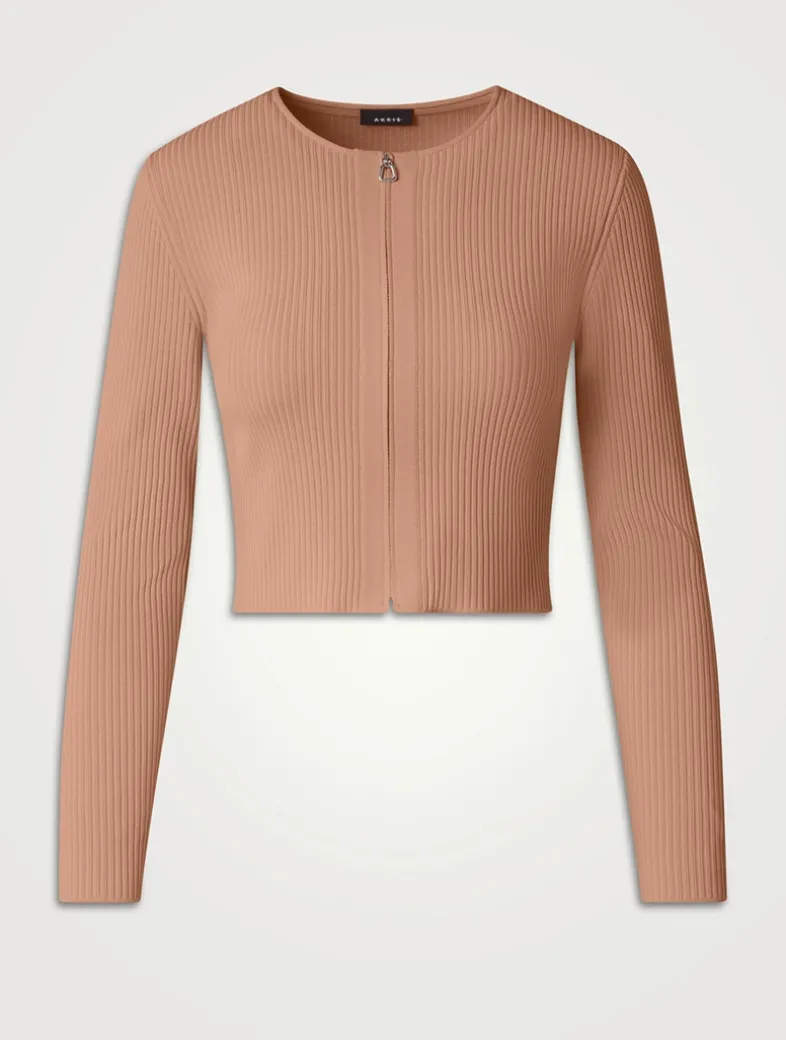 In a crêpe stretch fabric, this cropped cardigan is a modern addition to your wardrobe. The simple round neck and minimalist covered zipper add to the severe simplicity of the look.