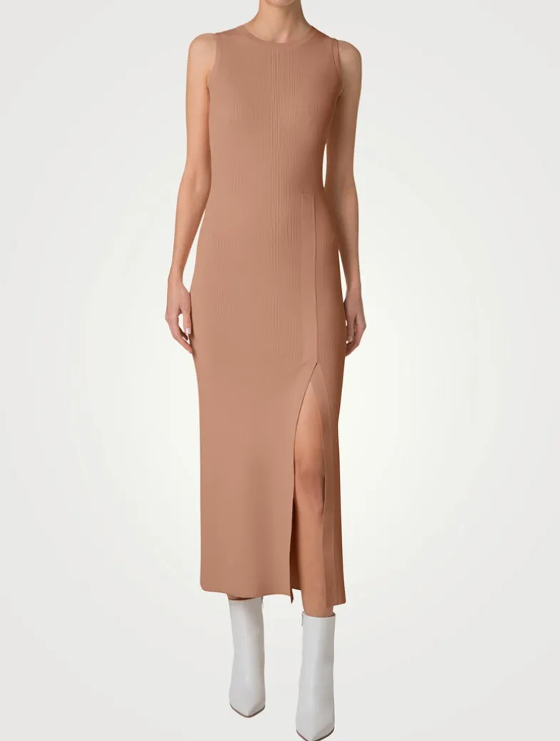 In a crêpe stretch fabric, this body-hugging tube dress is modern and minimal. The simple round neck and midi length are offset by the racy thigh-high slit at the side.