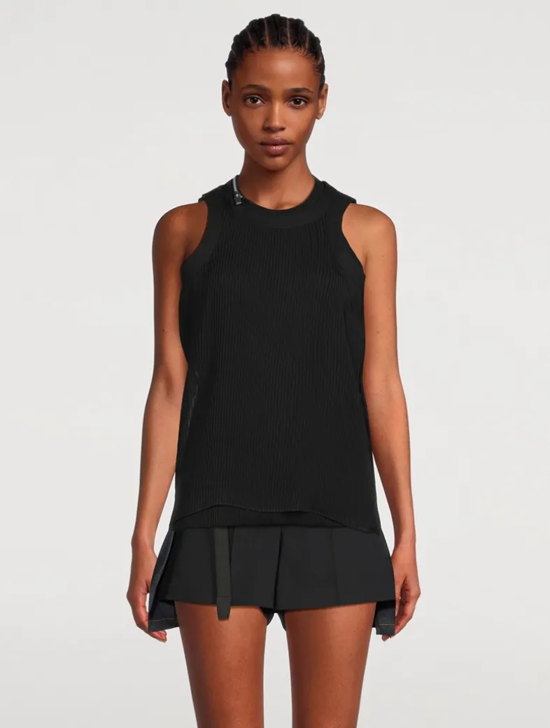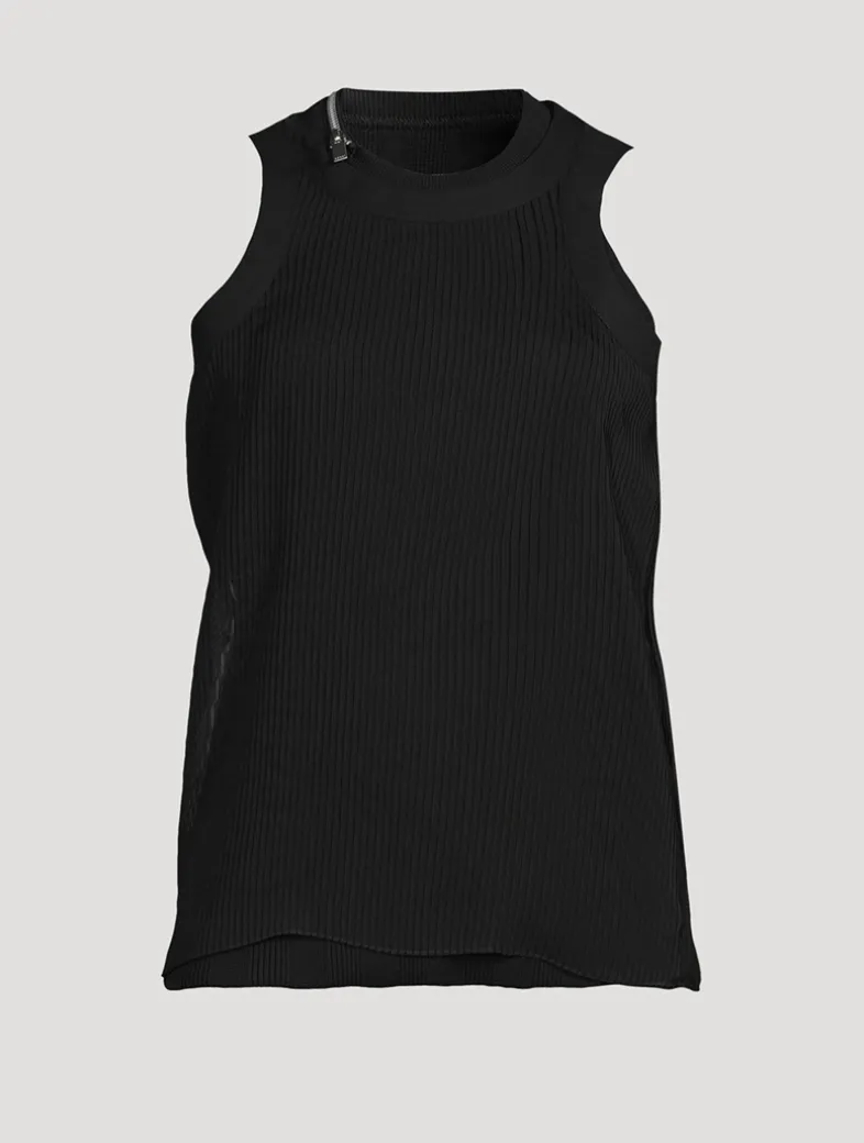 This ribbed jersey tank top is cut in a curve-hugging silhouette. It is embellished with zippered trim at the neckline.