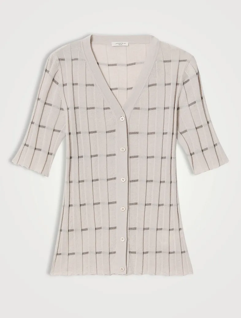 Exceptionally soft and light in fine-spun cashmere, this short-sleeve cardigan features contrasting stripes woven into the wide ribbed design. It fastens with mother-of-pearl buttons.