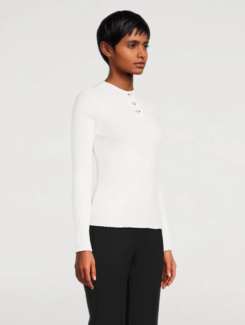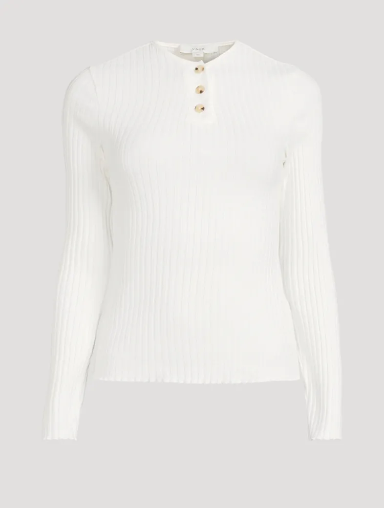 Embellished with faux horn buttons, this long-sleeve Henley shirt is cut with a slim-fit silhouette, and features a sweater-like construction. Finished with a ribbed knit pattern to add dimension and depth throughout.