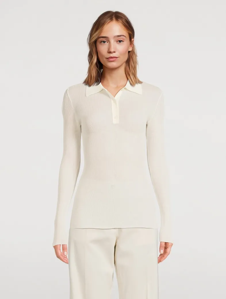 Cut to a slim silhouette, this long-sleeve polo has a soft cotton-blend construction with a rib-knit texture. It features a pointed collar atop a three-button closure.