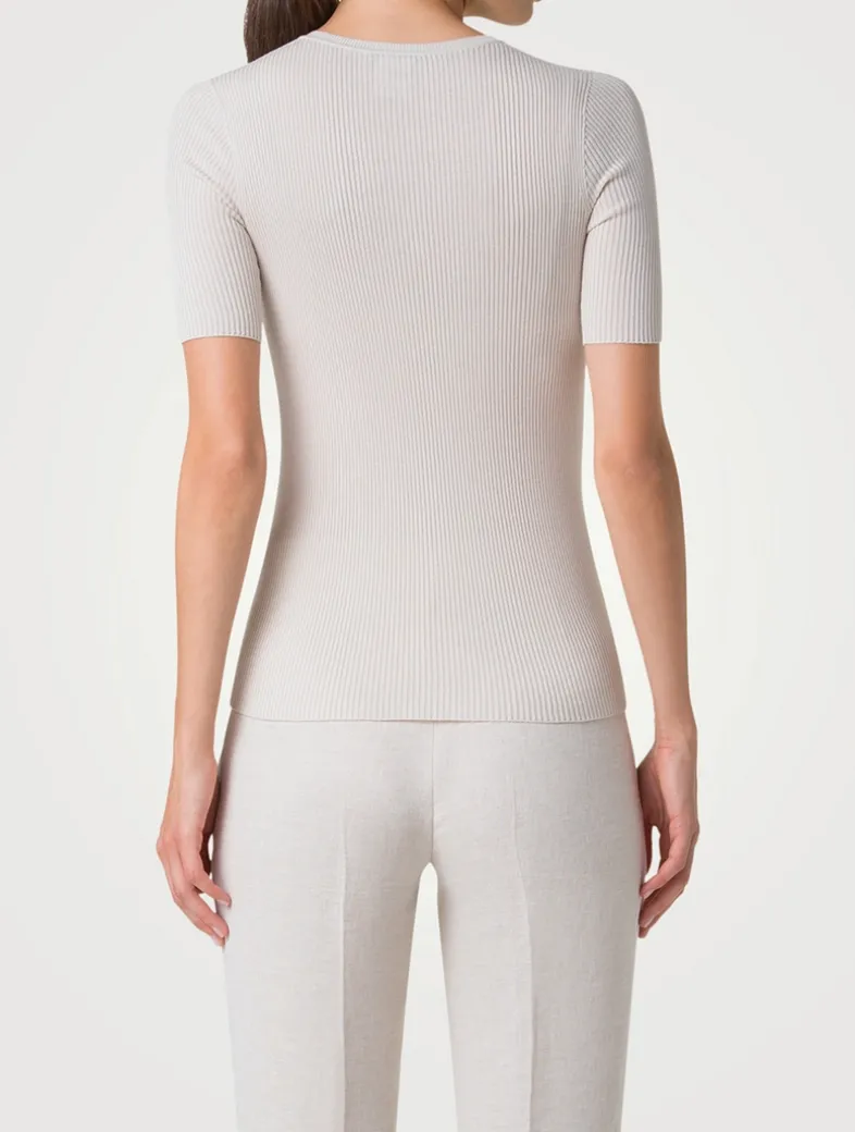 This lightweight rib-knit sweater is cut in a classic T-shirt shape. The silk-cotton blend is fashioned to be a seamless knit that fits close to the body.