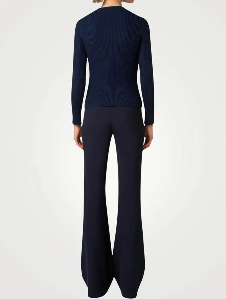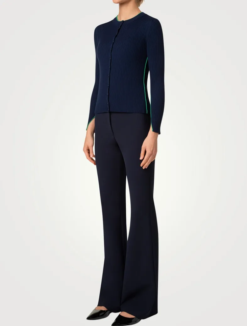 A delicate ribbed finish lends a textured touch to this merino wool cardi. It is detailed with subtle contrast piping at the collar, side seams, and sleeves.