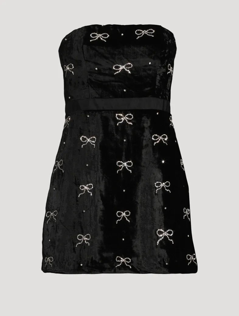 This elevated evening piece is designed from a drapey, velvet fabric embellished with delicate hand-applied pearl bow appliqués and tiny individual pearls all over. A flirty dress, the strapless mini cinches at the waist for a flattering and feminine fit.