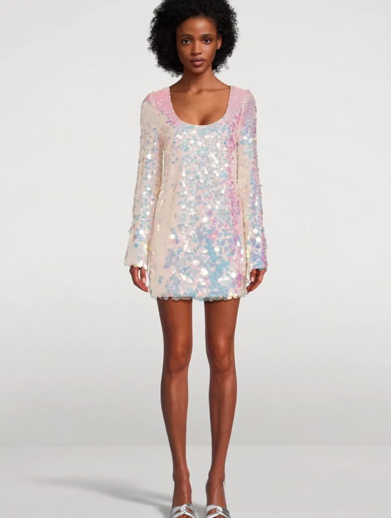 Disco dream comes true in the Risbo Dress. This mermaid-inspired party dress debuts with iridescent, light-catching paillettes that gradually go from smaller to larger as the flow down the mini. A body-skimming silhouette and long bell sleeves give this piece a flattering fit.