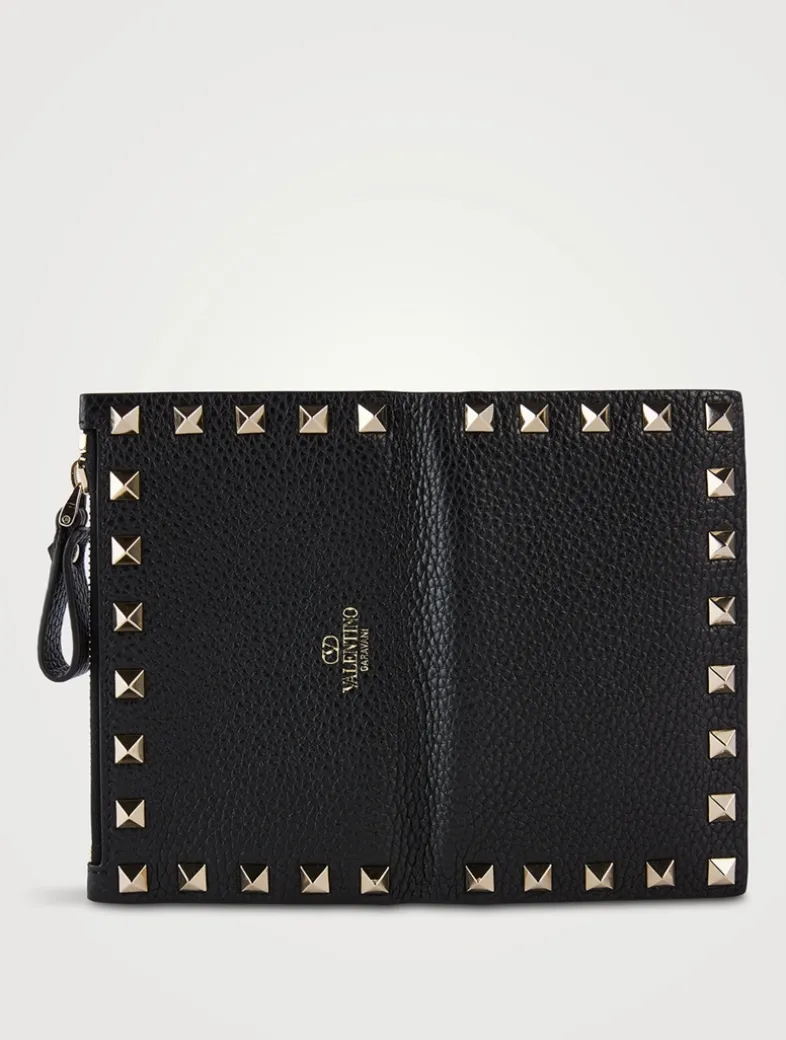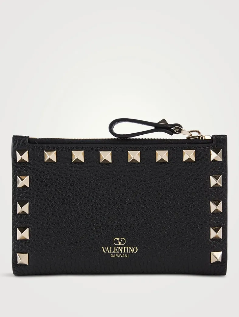 Trimmed with signature Rockstuds, this leather wallet has a snap-button closure to conceal six card slots and two flat pockets. Finished with a zippered coin pocket.