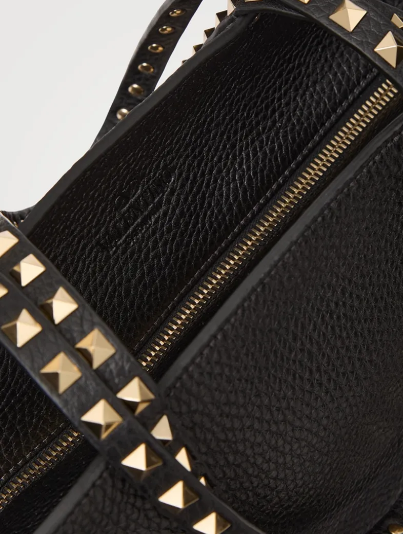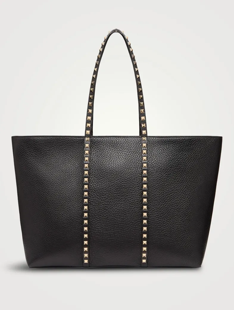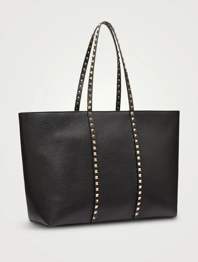 Crafted from grained leather, this tote has a softly structured silhouette embellished with delicate studded hardware. It has a single interior compartment with a matching zippered pouch.