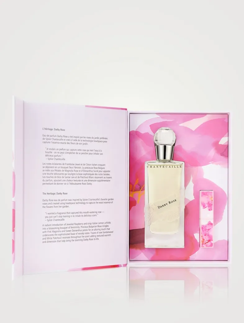 Darby Rose Eau de Parfum: A fresh, modern take on a classic rose scented perfume. A radiant introduction of Jewelled Raspberry and crisp Italian Lemon unfolds into a blossoming bouquet of femininity. Precious Bulgarian Rose mingles with Pink Magnolia and Sweet Osmanthus petals for an alluring touch that underscores the sophisticated base of woody notes. Traces of rare Sandalwood and White Patchouli resonate throughout the scent, adding textured warmth and dimension that help bring the stunning Darby Rose to life. The scent was inspired by Sylvie’s favourite garden roses and created using headspace technology to capture the exact essence of the flowers from her garden.