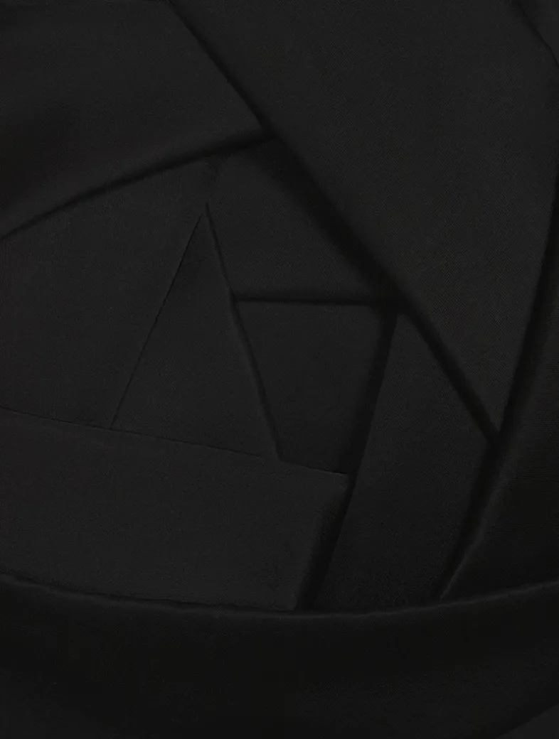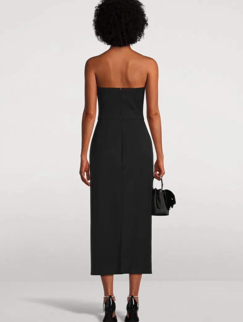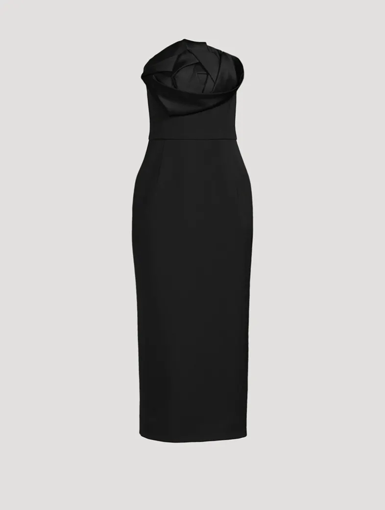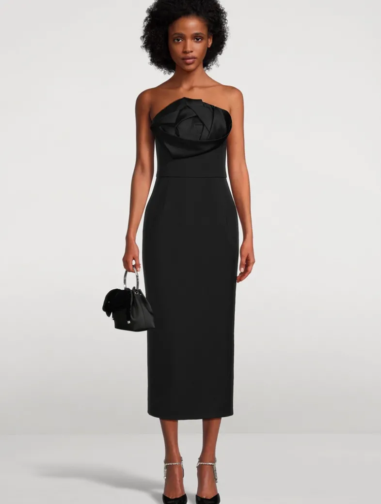Inspired by origami techniques, this tea-length gown spotlights an intricately folded rose at the bust. With a strapless neckline and streamlined silhouette, this piece will be a forever favourite.