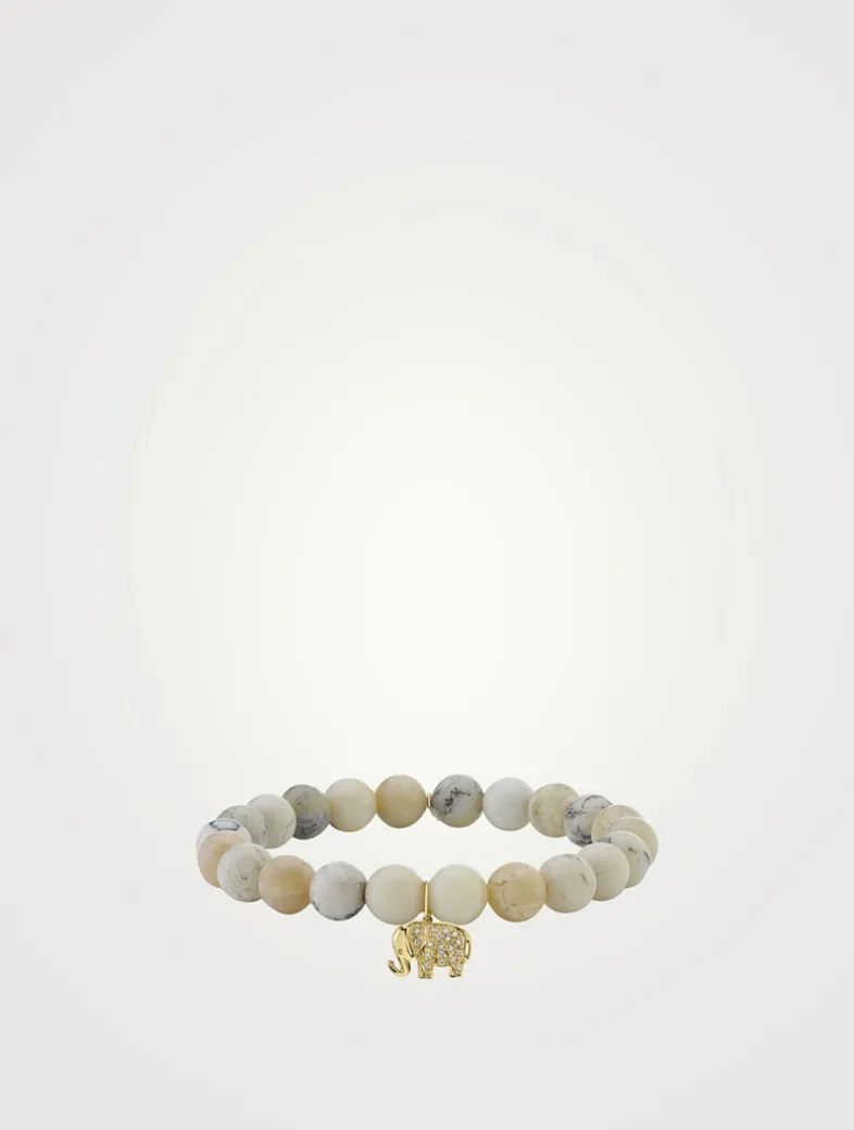 Strung with round African opal beads, this bracelet features a 14k yellow gold and diamond elephant charm. All SYDNEY EVAN beaded bracelets are strung on a stretch cord along with their 14k gold SE logo charm.