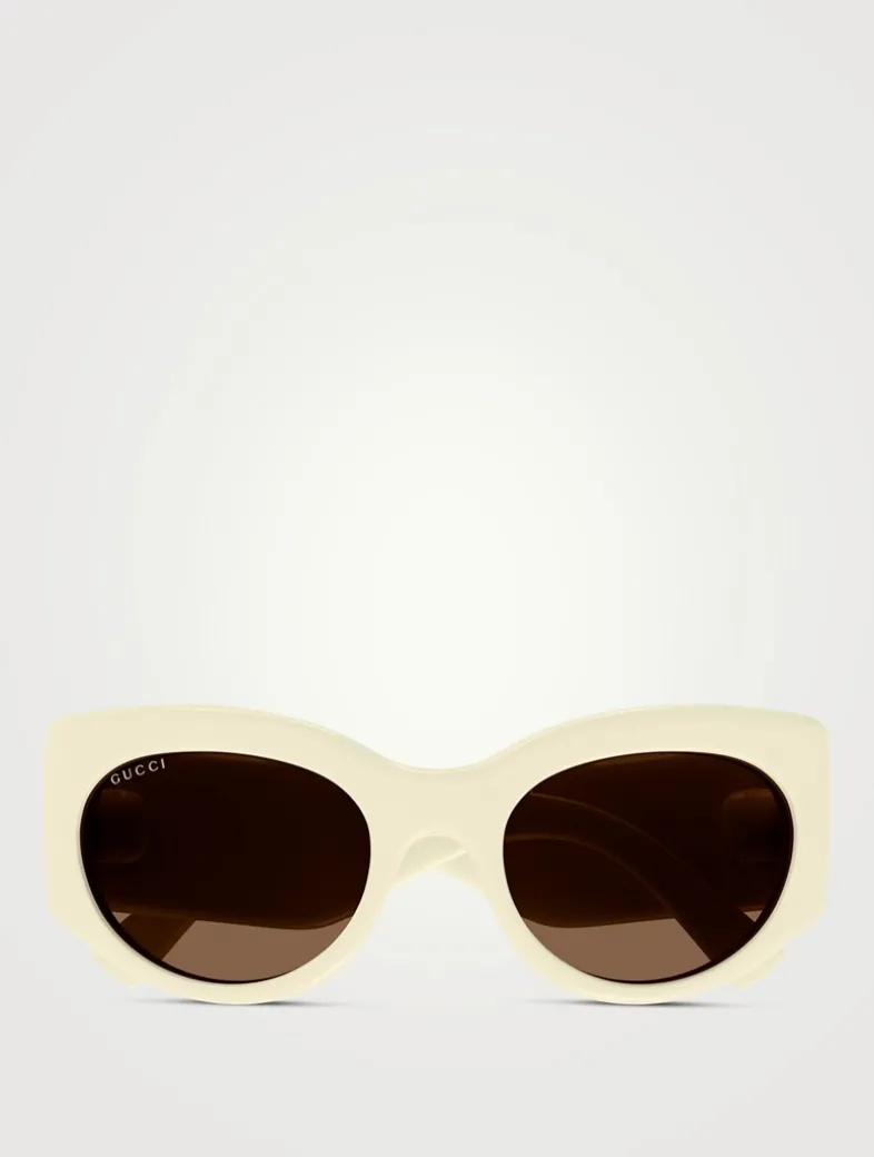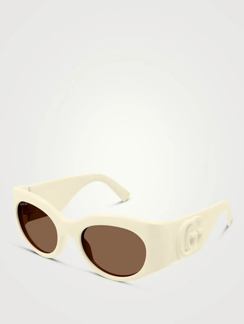 Made with a bold glossy injection frame, these round sunglasses have a sleek upswept shape. Tonal Double G’s at the temples are a modern, signature finish.