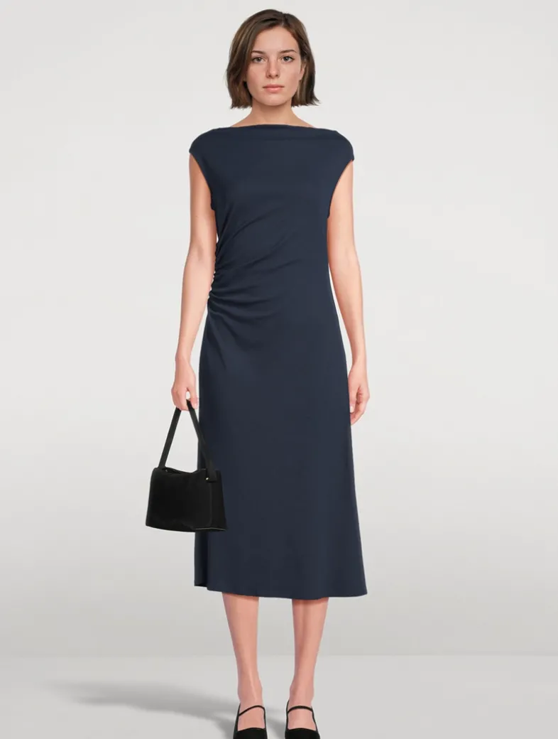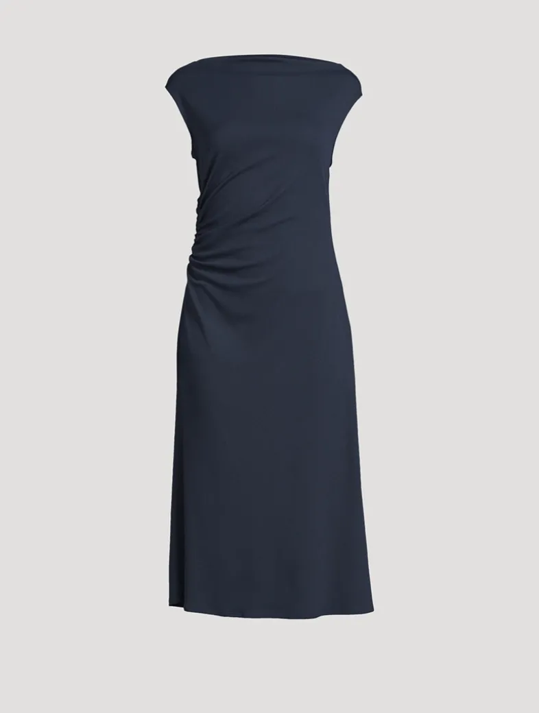 Cut along a boat neckline, this sleeveless dress is tailored for a curve-hugging sheath silhouette with an invisible side zip closure. It’s crafted with an Italian crêpe jersey with an elegant drape.