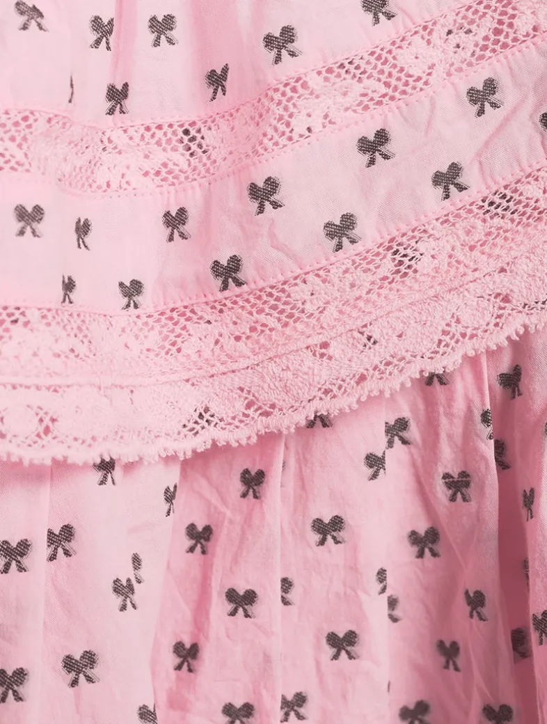 This ruffled mini skirt is made in a textured, cotton fabric featuring a clip bow and bow dot woven throughout. It features intricate inset lace trims and allover pintuck details. The elasticated waistband offers flexibility in comfort and styling. Tiered ruffles exude effortless femininity. The mini is finished with a frayed, raw hem for added playfulness.