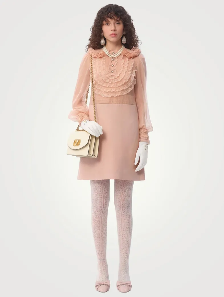 This silk dress is crafted in Valentino’s signature crêpe couture fabric with partial lace and organza embroidery. The semi-sheer bodice is framed by a ruffled Peter Pan collar and features jewelled buttons at the front and cuffs. A silk Habotai lining completes the look.