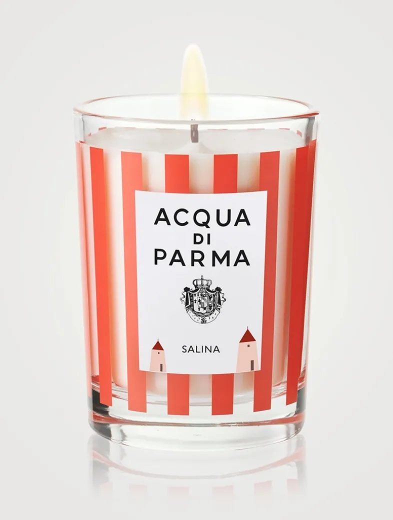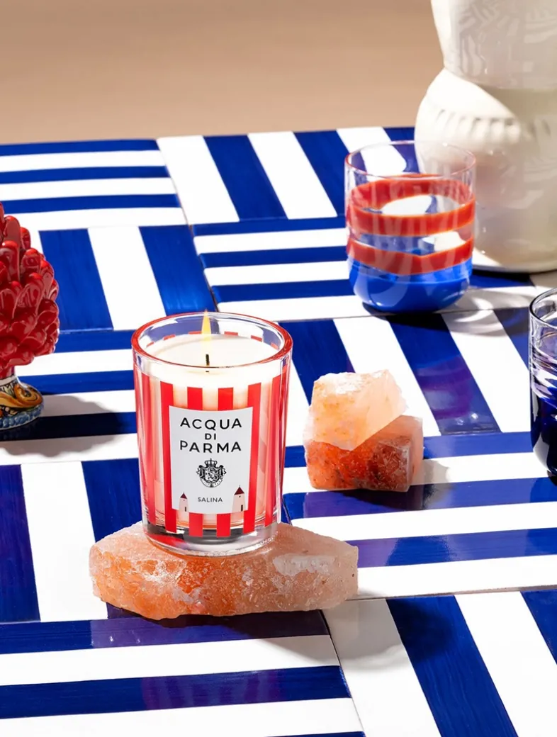 Set in a coral and white stripe jar designed by Ben Arpea, the seasonal exclusive candle diffuses a scent embodying the salt marshes on the legendary Salt Road of Sicily.
