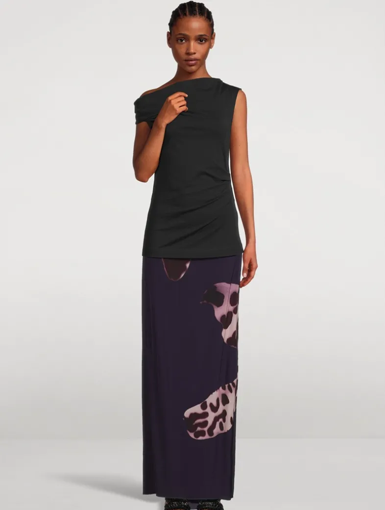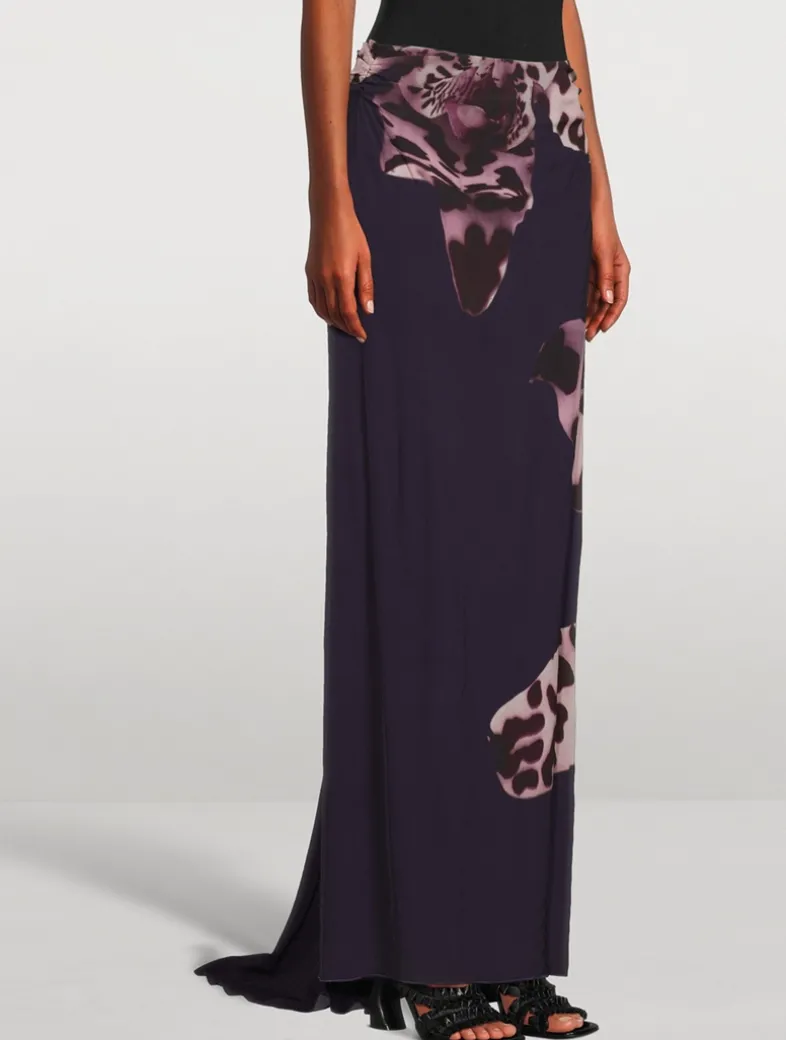 This floor-length skirt features back draping for a train-like effect. Crafted in viscose, it is printed with a placed Leopard Orchid motif.