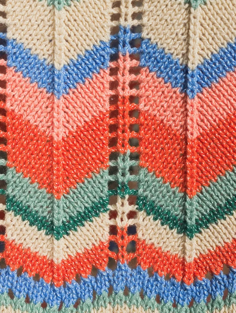 A multicolour chevron pattern lends a graphic touch to this sleeveless mini dress. Knit from a cotton blend in an open-weave crochet construction, edged with scalloped trim.