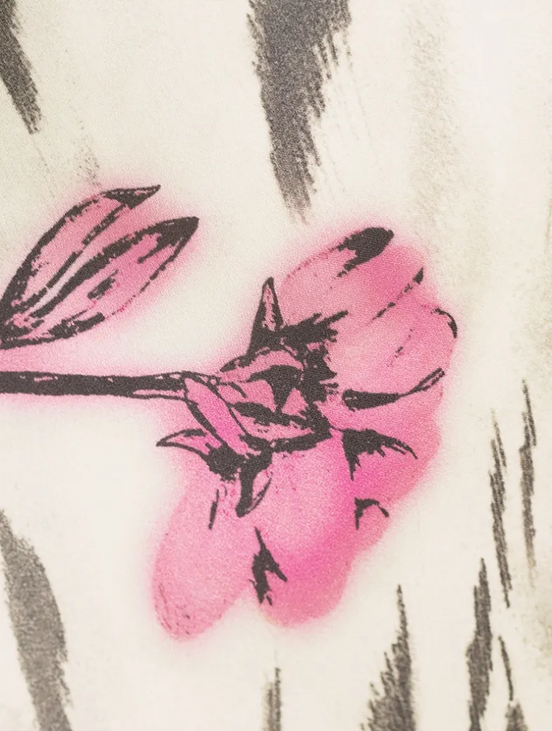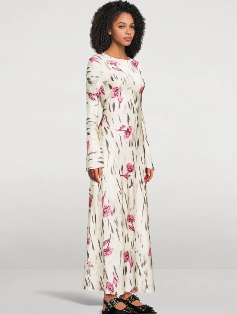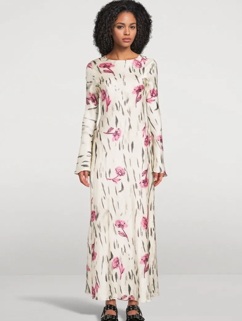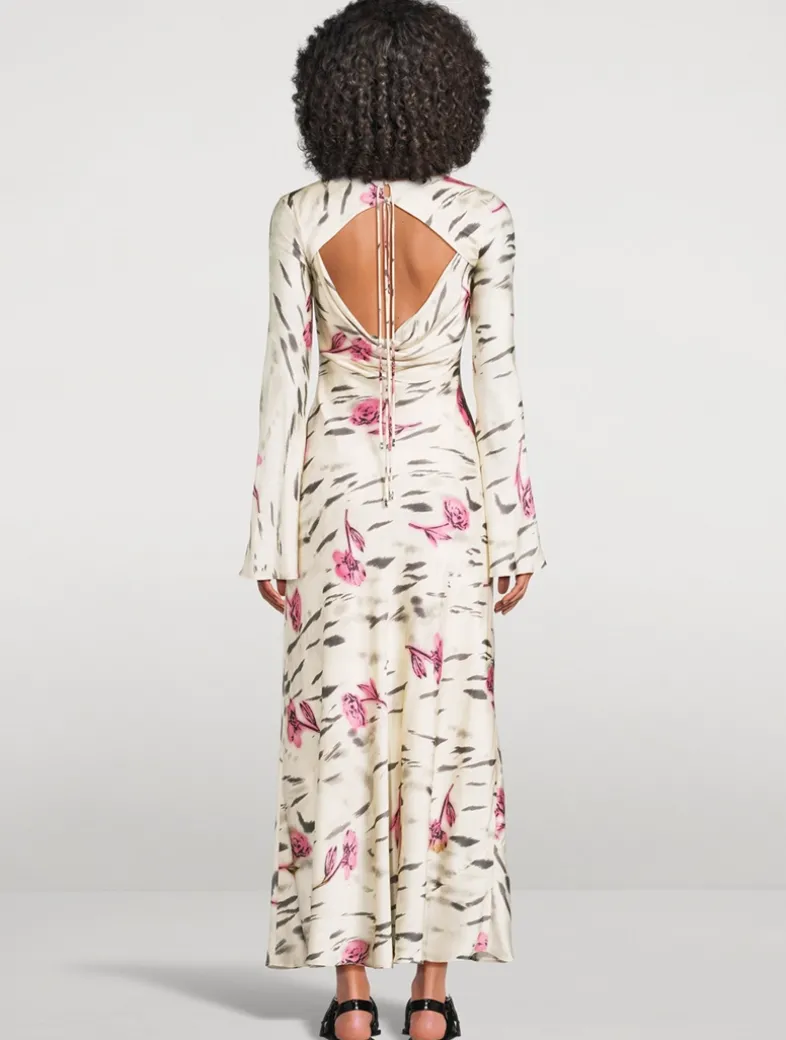Printed with florals, this bell-sleeve maxi dress in stretch satin features an open draped back finished with adjustable ties.