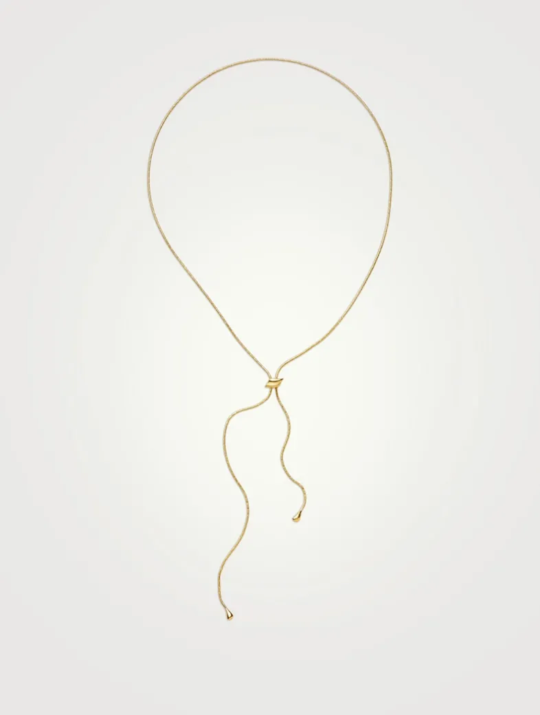 This statement snake chain lariat necklace features two droplet pendants with a matte and high shine finish, as well as an adjustable signature Savi ‘S’ slider for added versatility. Wear your way as a choker or as a medium necklace.