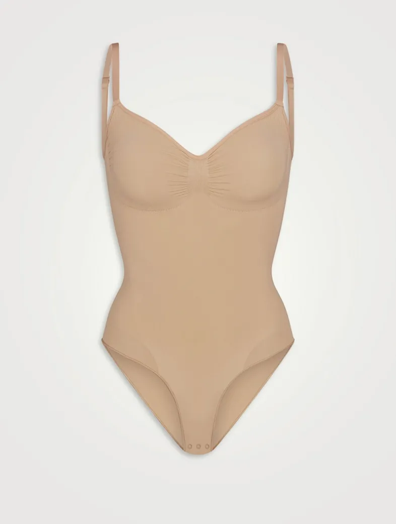 SKIMS’ viral sculpting bodysuit, updated for an even better fit. This figure-enhancing style has extra compression at the core and waist, perfectly-placed style lines that flatter your bust, and rounded butt pockets for a lifted look. Features adjustable straps, a wide crotch for added coverage, and a cotton gusset with snap closure.
