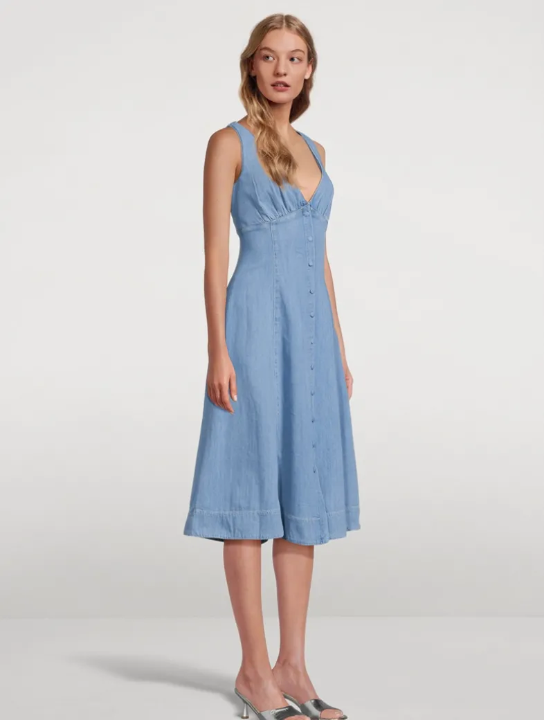 This breezy linen midi has a plunging neckline embellished with softly gathered detailing under the bust. Designed to be fitted at the bodice, it flows to an A-line skirt. Finished with a row of buttons lining the front.