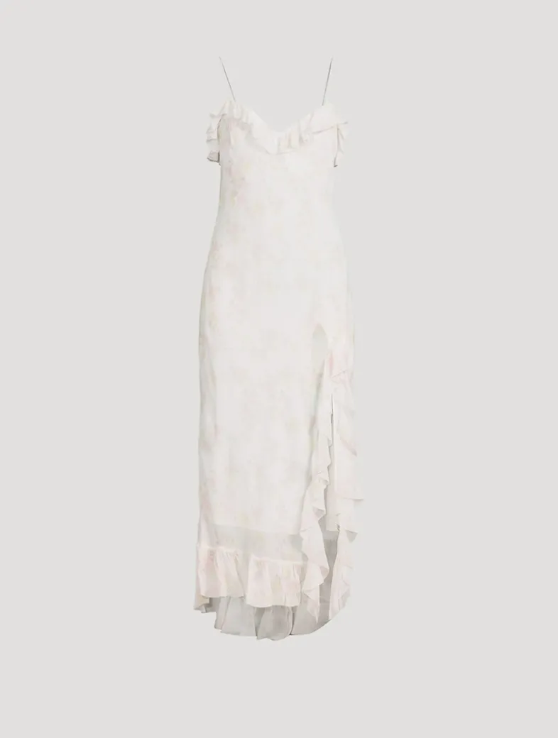 This slinky slip dress is embellished with fluttering ruffles along the neckline, hem, and side slit. It is printed with a faded floral motif, enhancing its romantic elegance.