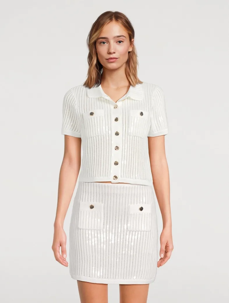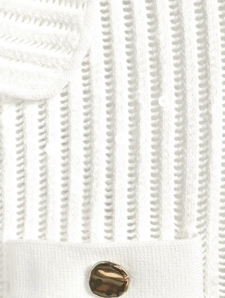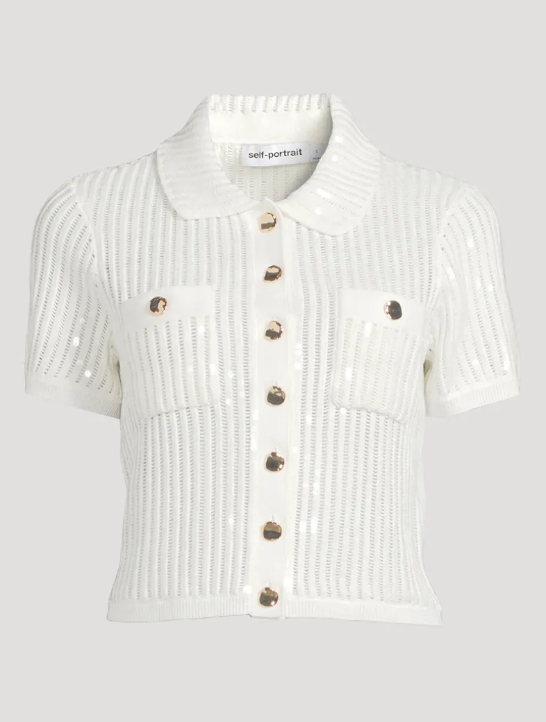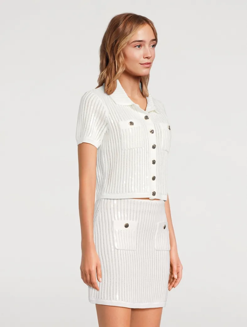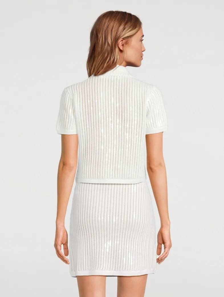 A glam spin on a refined classic, this cashmere and cotton crochet cardi is embellished with shimmering sequins. It has a button-front closure, a pair of pockets at the chest, and rib-knit trim at the cuffs and hem.