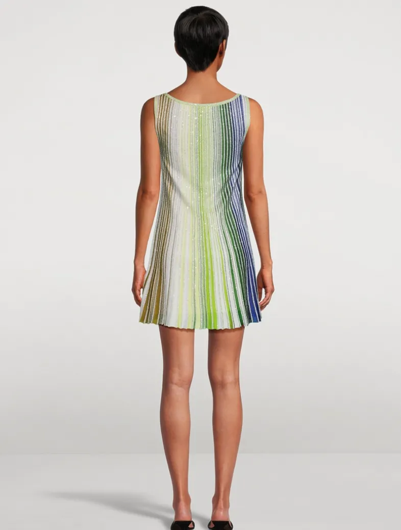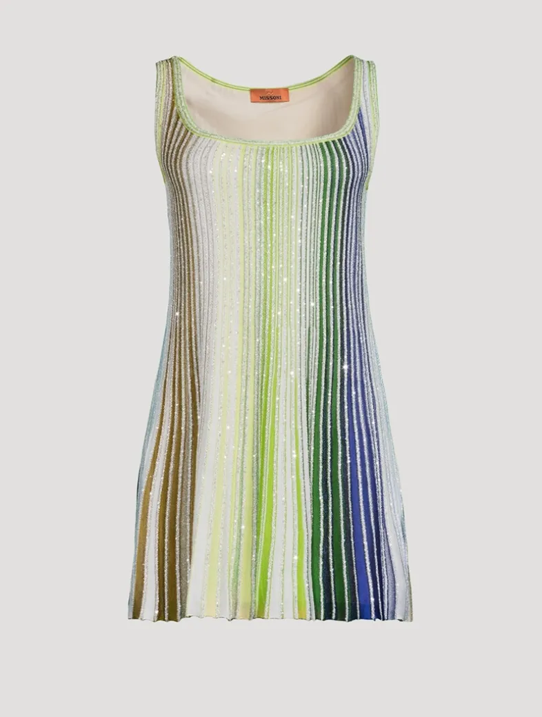 Crafted from the brand’s signature knit fabrication, the mini dress is illuminated by a shower of applied sequins. It has a flattering design with a square neckline, shoulder straps, and a pleated texture.