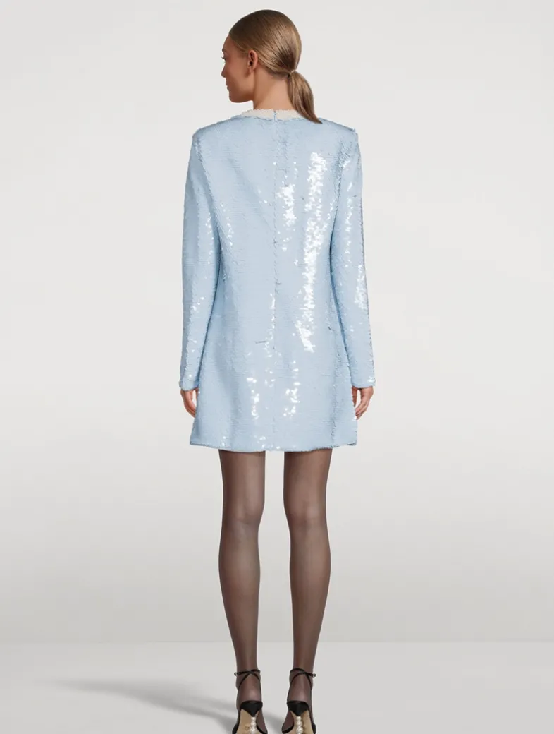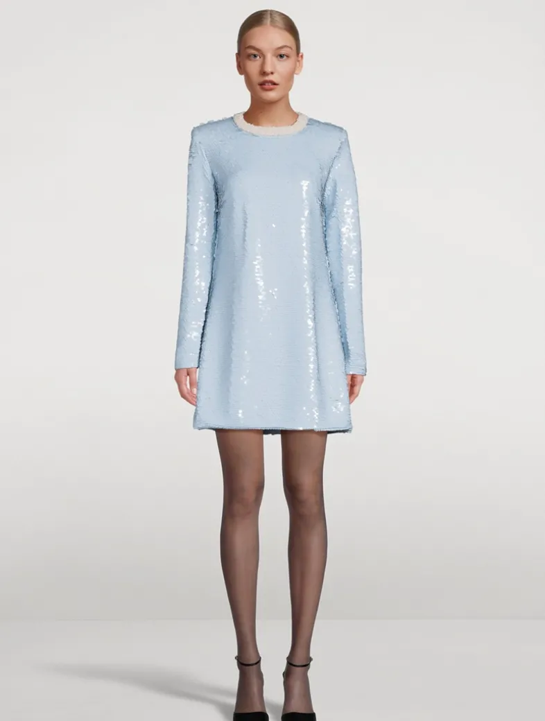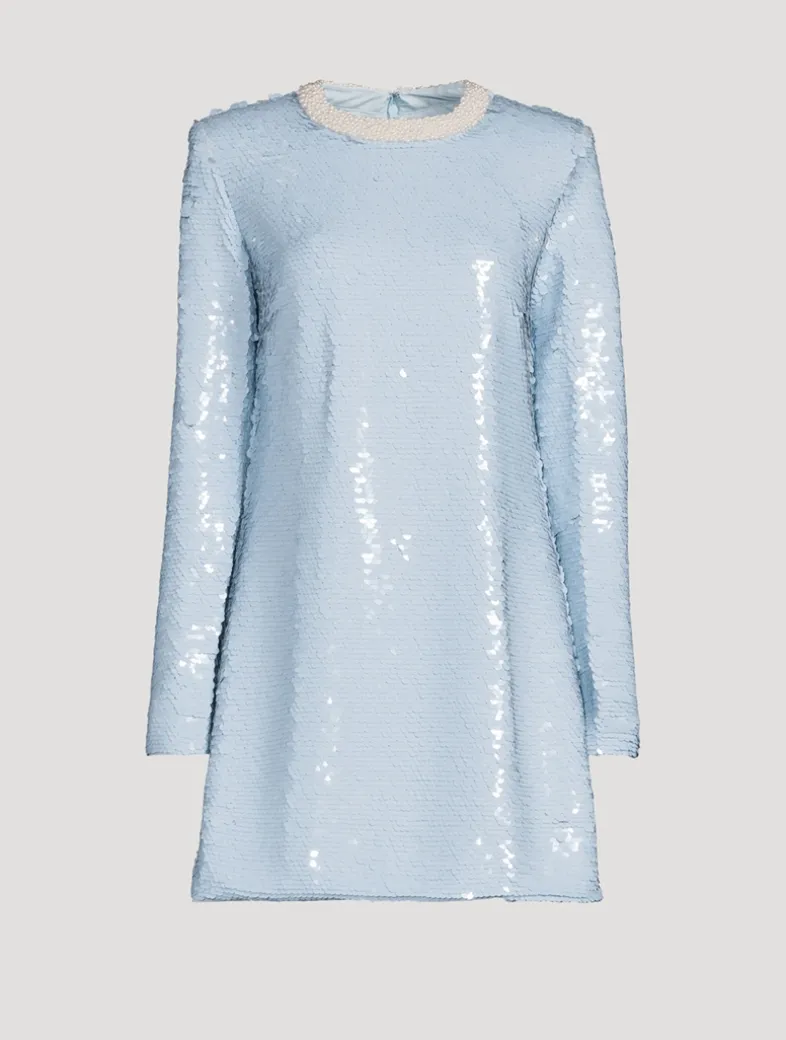 A mini dress in an irresistibly flattering silhouette, adorned with liquid-like sequins that add a sparkling touch. The fitted, fully lined design is finished with an elegantly embellished neckline and long sleeves.