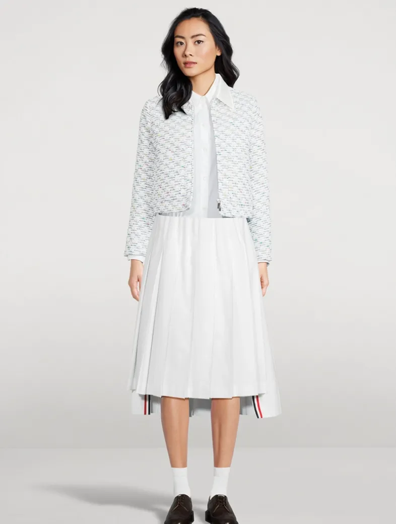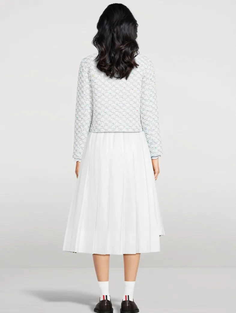 A refined choice for the season, the Sequin Tweed Jacket is an impeccable blend of tailored elegance and leisurely comfort. Sequin tweed is woven with chain thread, tulle, woolly yarn, sequins, and shiny ribbon. Padded with down for added warmth.